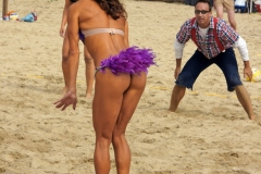 A game typically looks like this. Guys in old-fashioned boardshorts and a few girls in bikinis hitting the ball around. (We’re not sure why that fellow has angel wings tattooed on his back; profound philosophical statement, or too much tequila one weekend during Spring Break?)