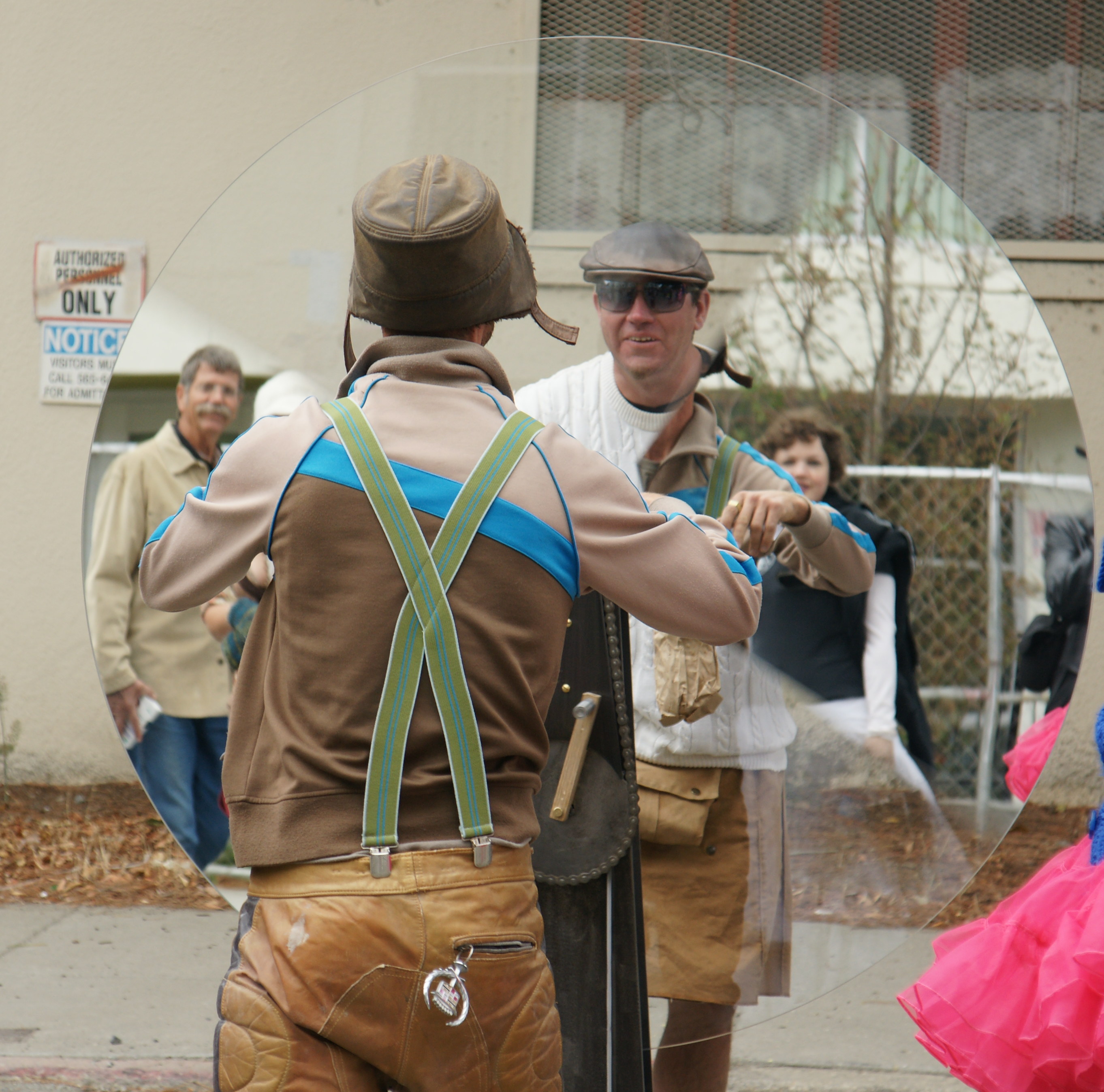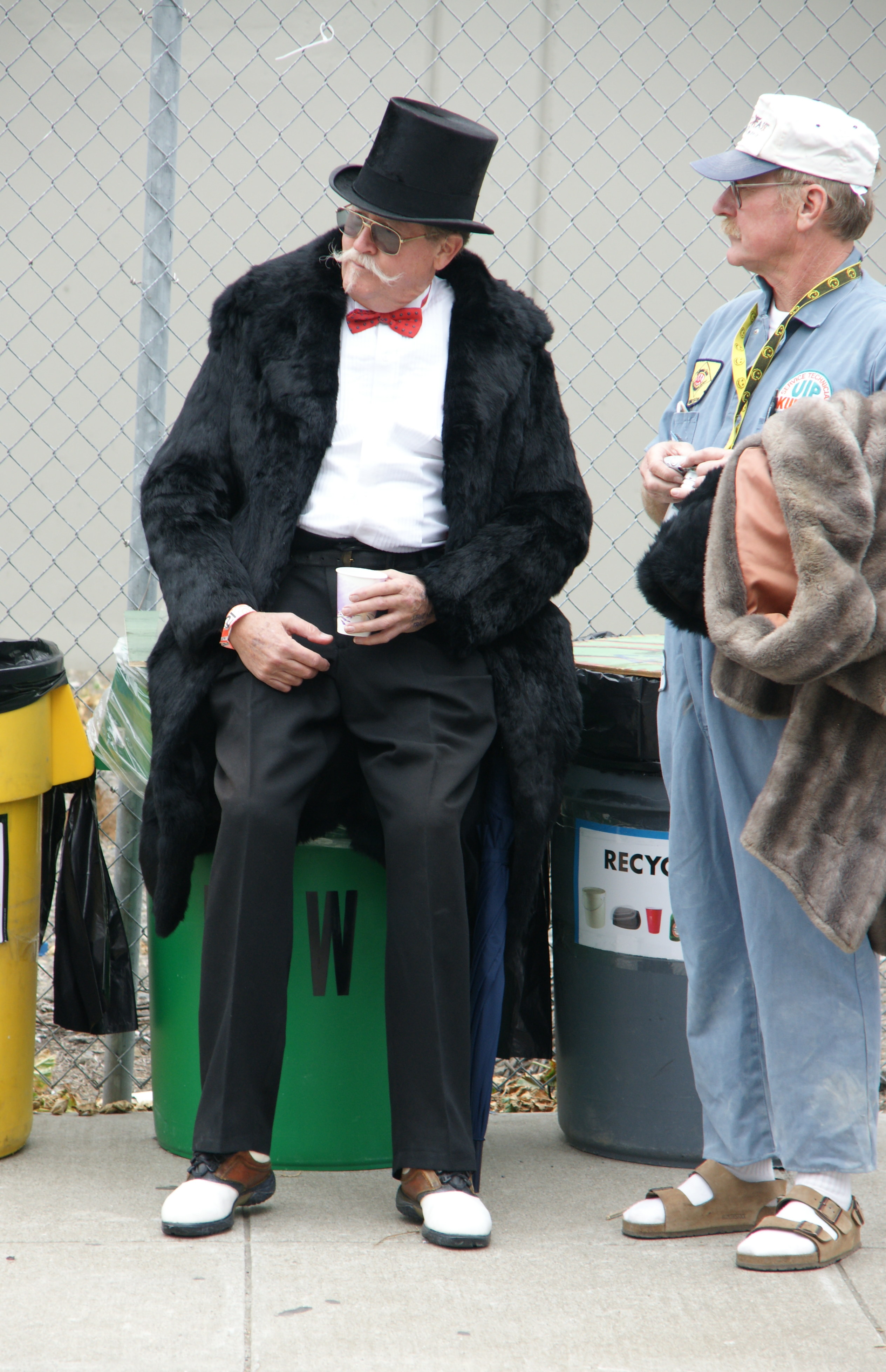 When you are wearing a top hat and bow tie, you can look good, even at an after party.  Note the chain-link fence keeping out non-after-partiers.  We think this chap is waiting for his race car to bring his boots, and maybe his iron.