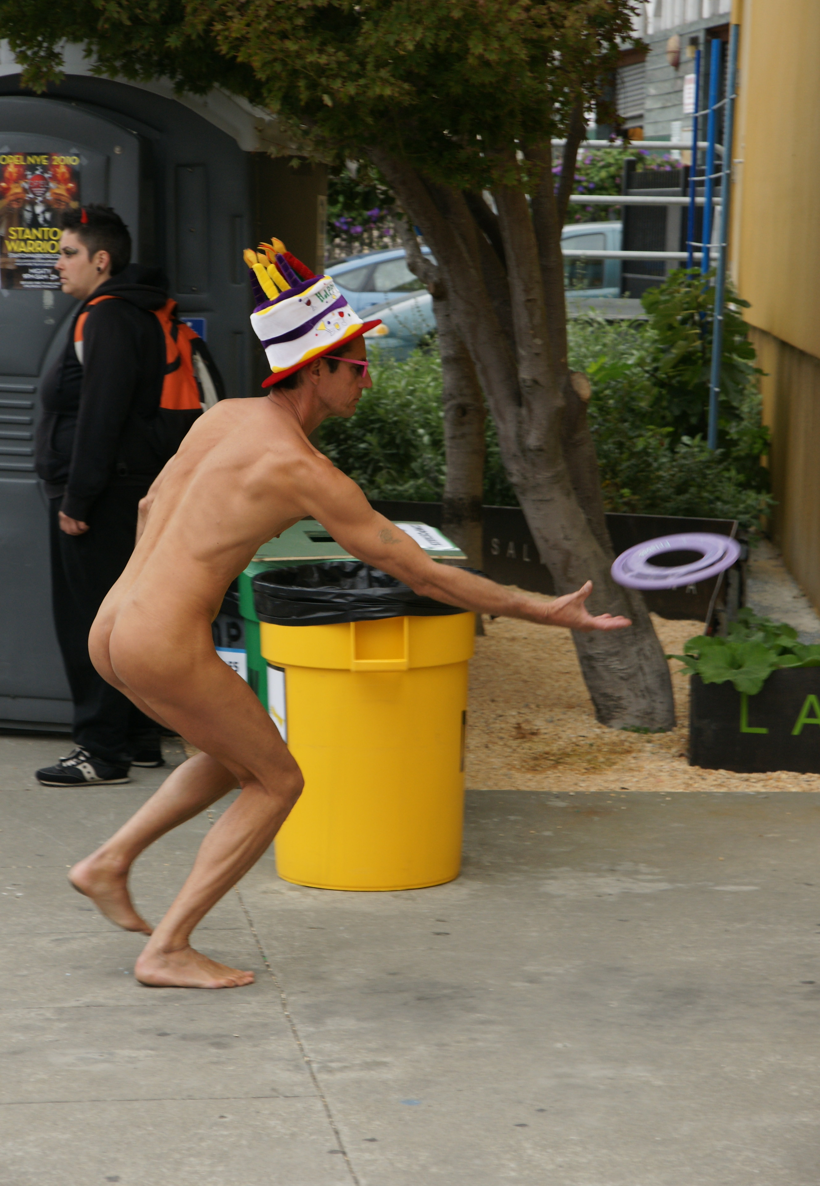 I suspect that this guy realized the amount of bacon to be consumed at an after party, and is just trying to save time in the porta potty.  However, my wife asserts that, this being San Francisco and Burning Man, perhaps he lives on a two-way street.