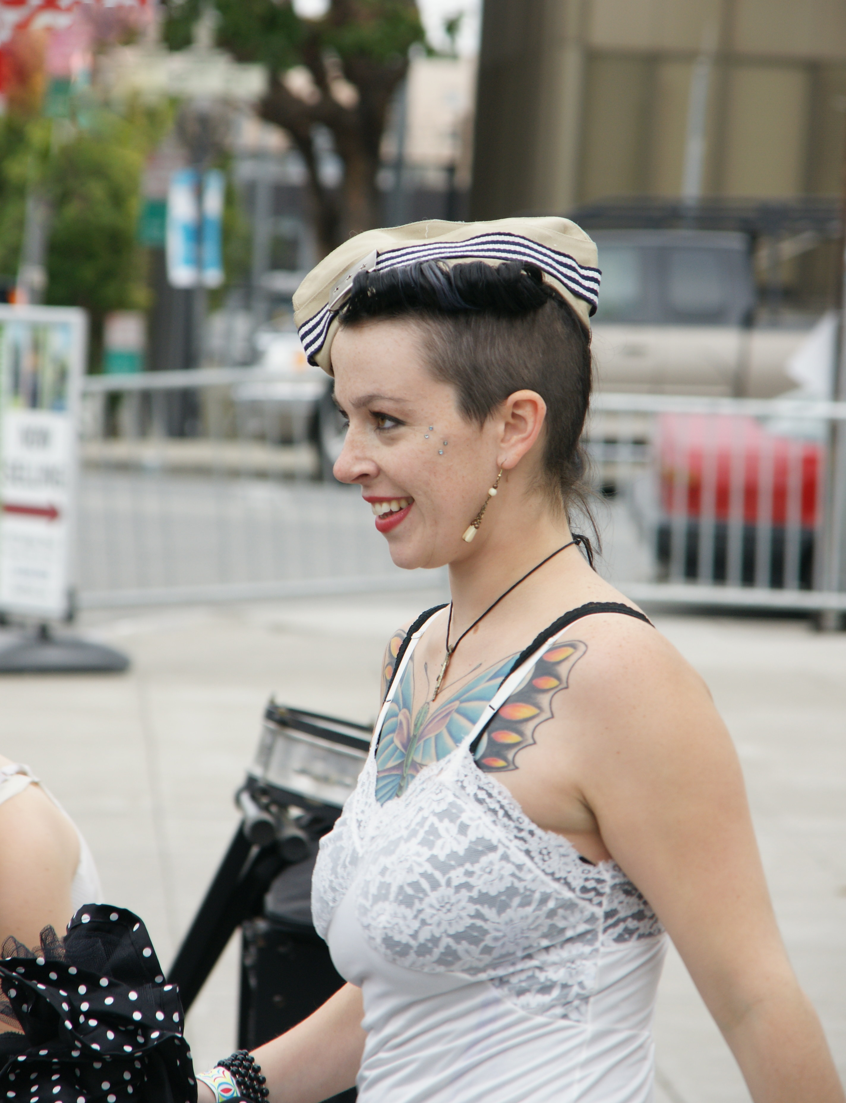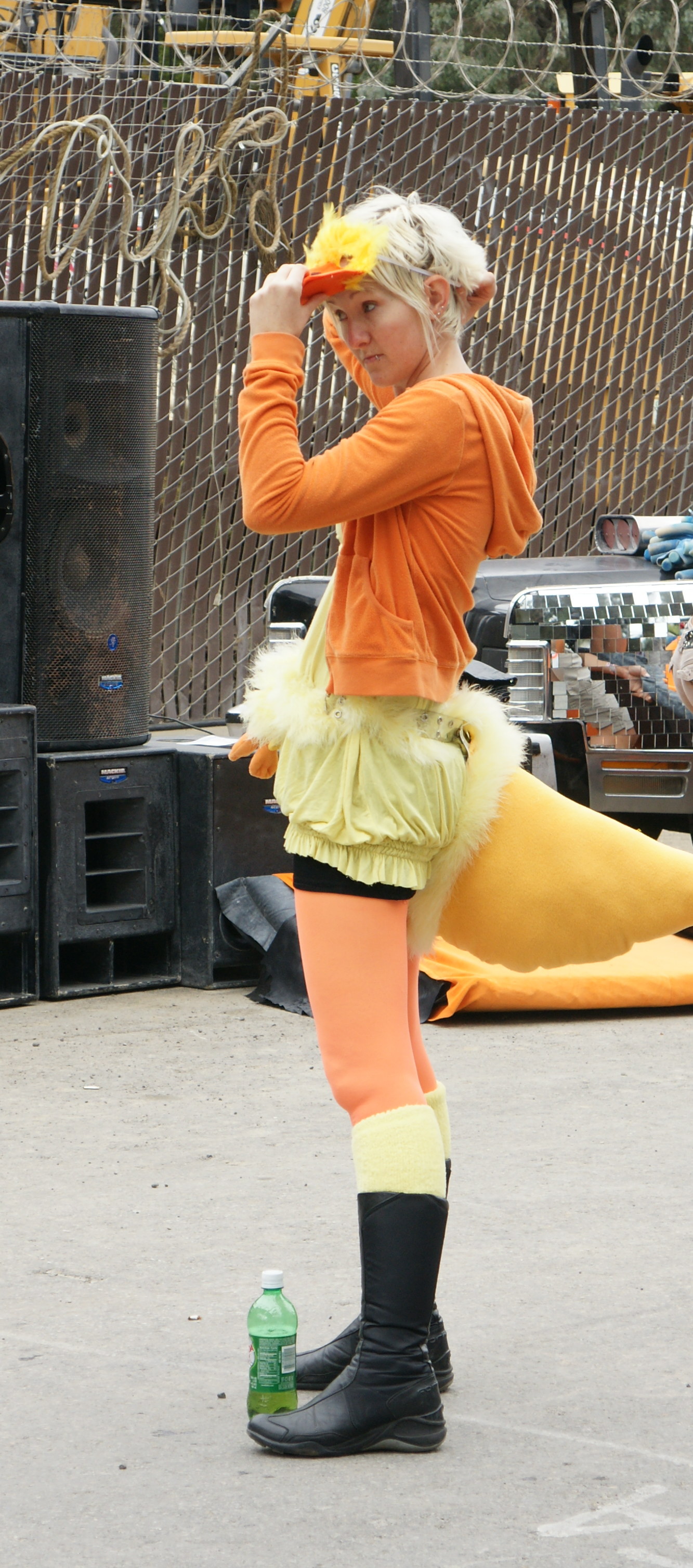 She probably rode to the event on a motorcycle and burned her bottom.  Wearing the short skirt helps keep it cool.
