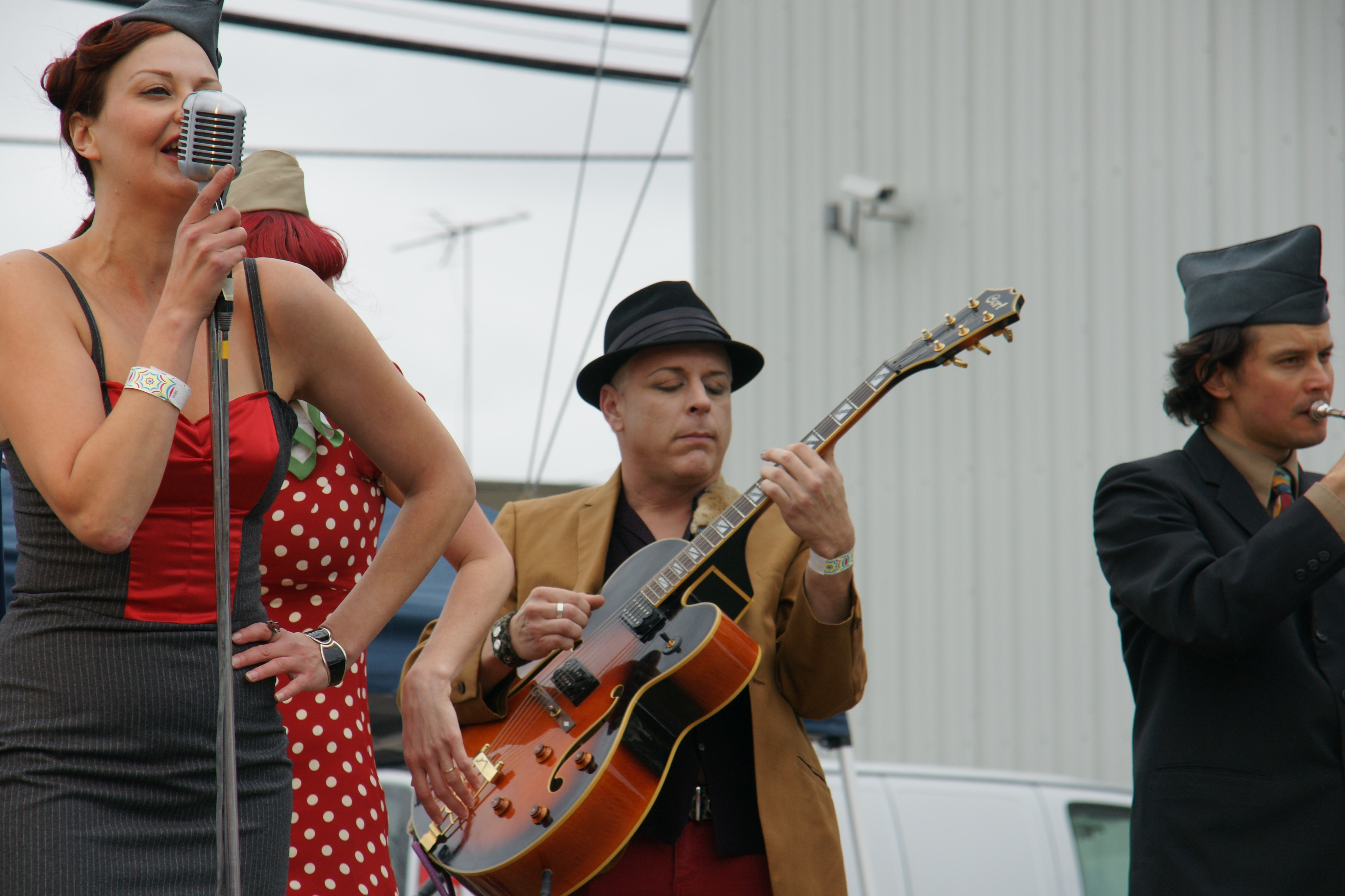 We are not sure what the theme of this band is.  The singer looks futuristic, while the two men-in-hat look like the arrived on the short bus.  ¯\_(ツ)_/¯