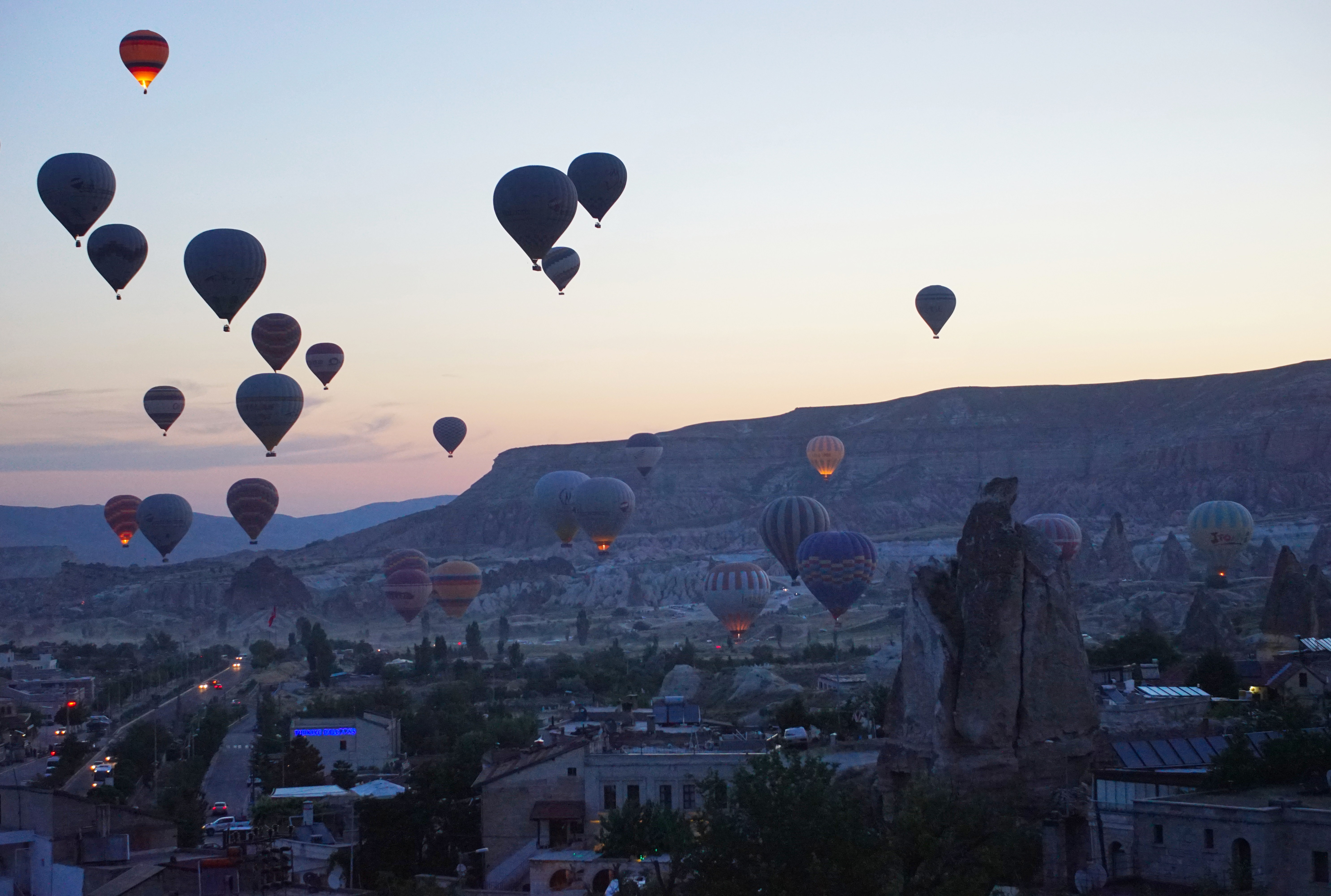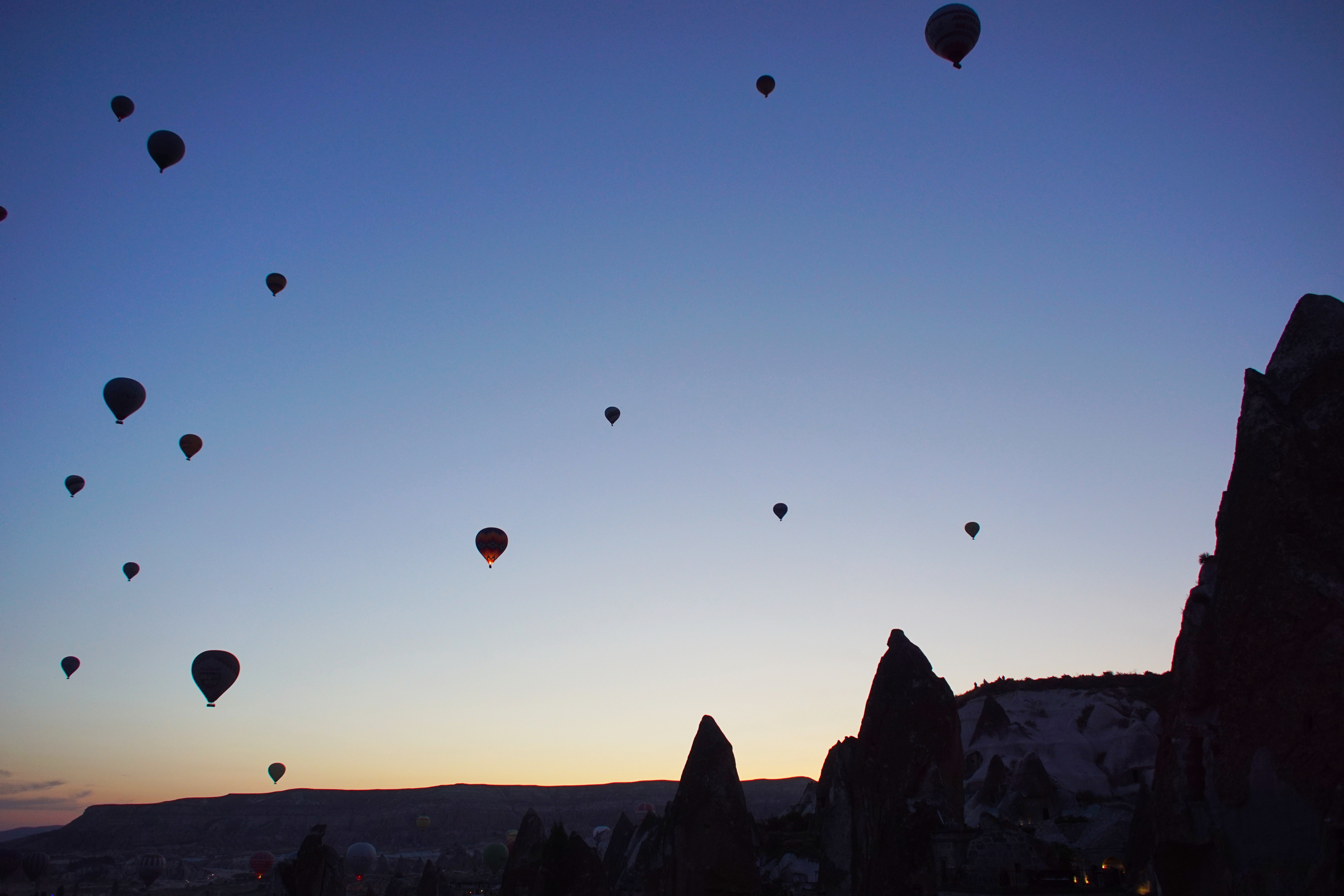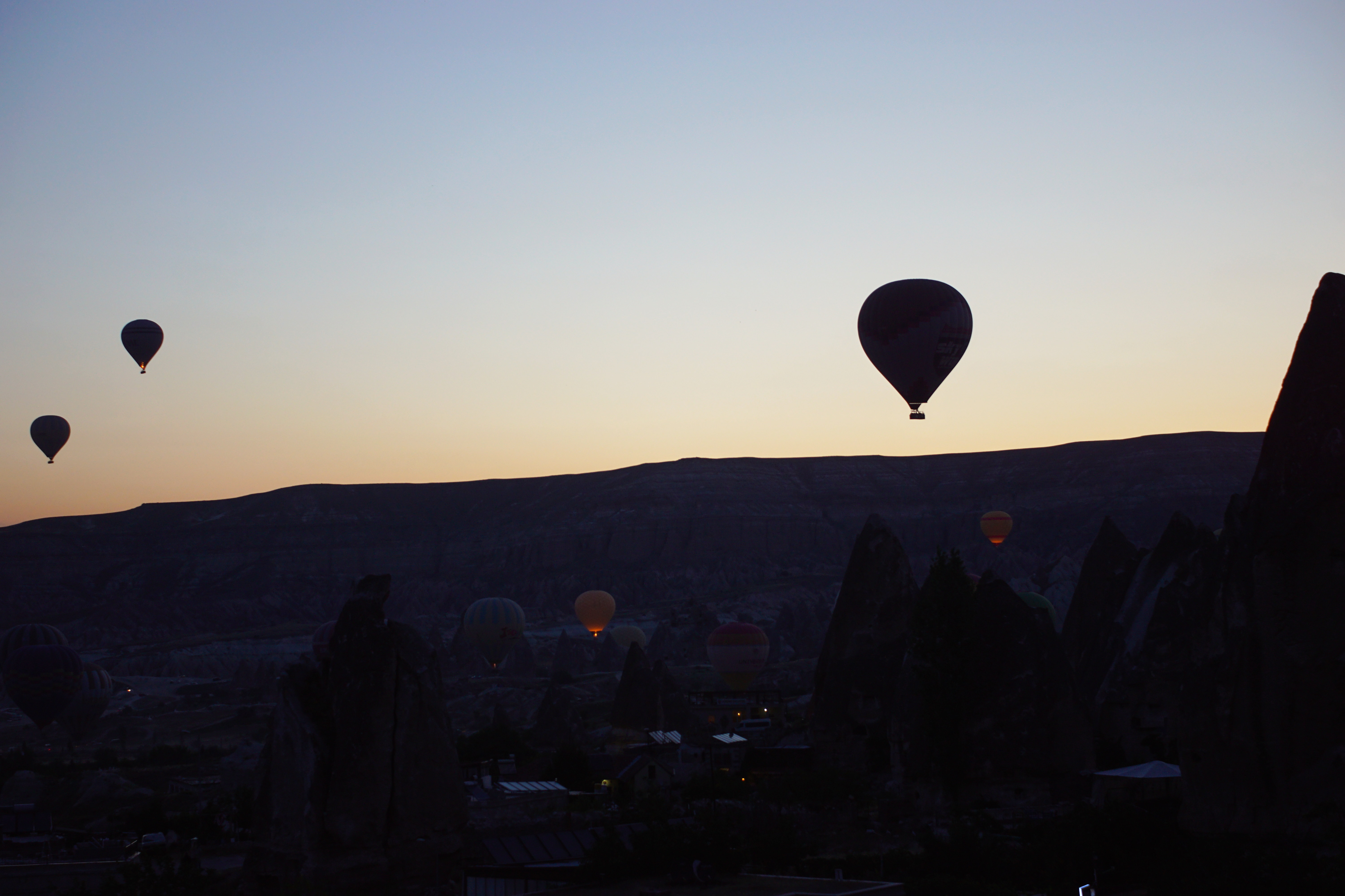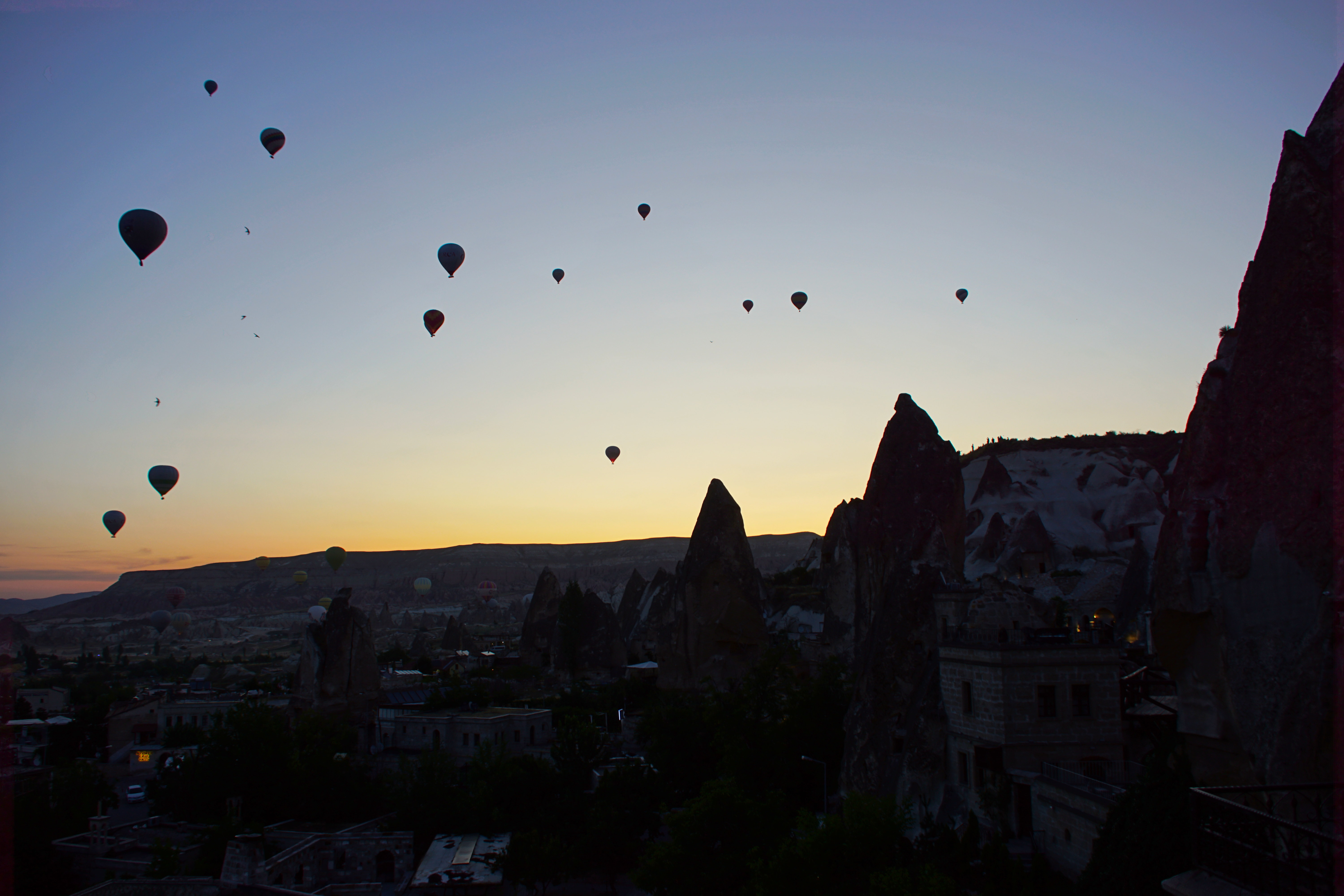 The setting sun ignites the Cappadocian skies.