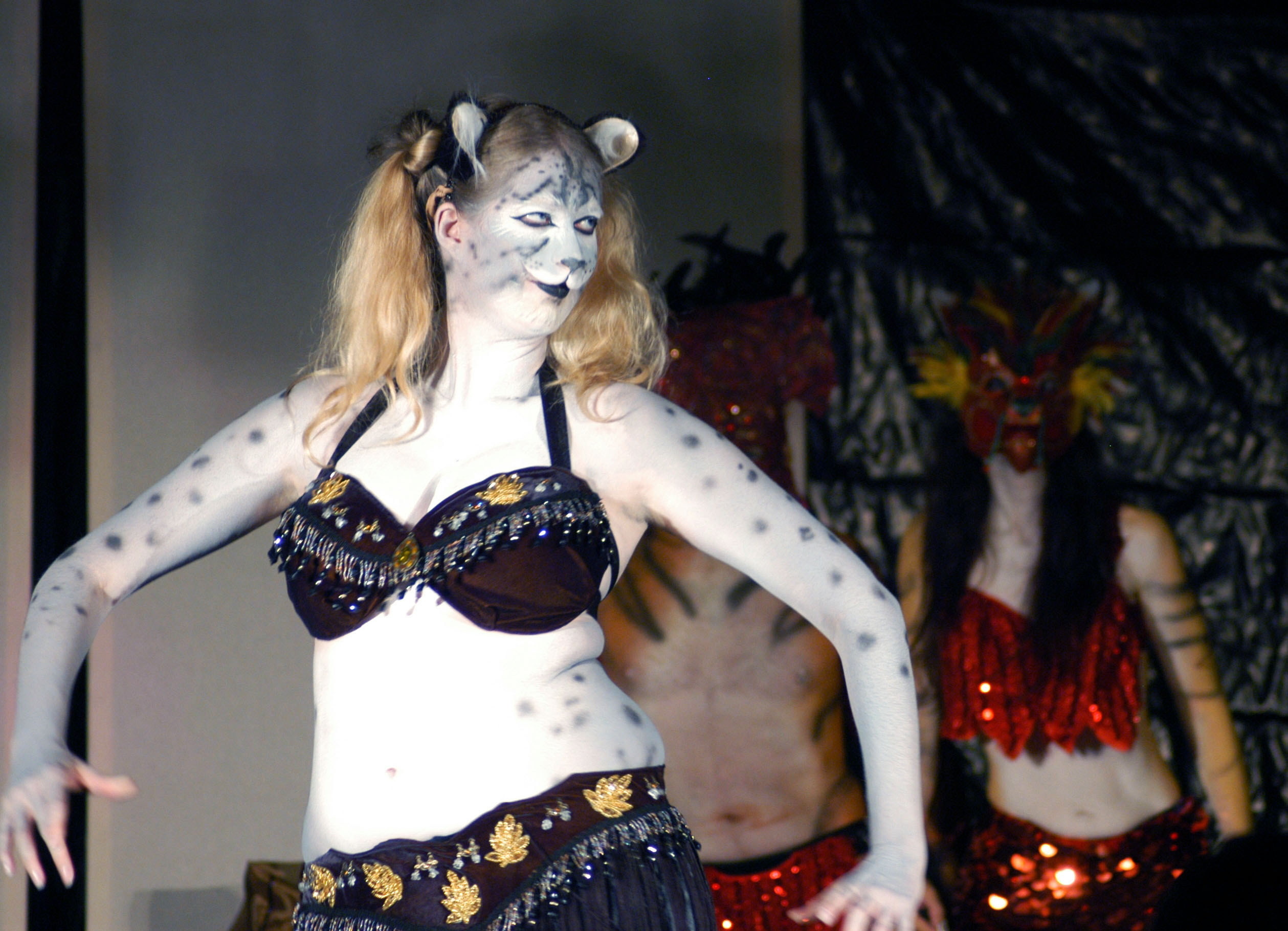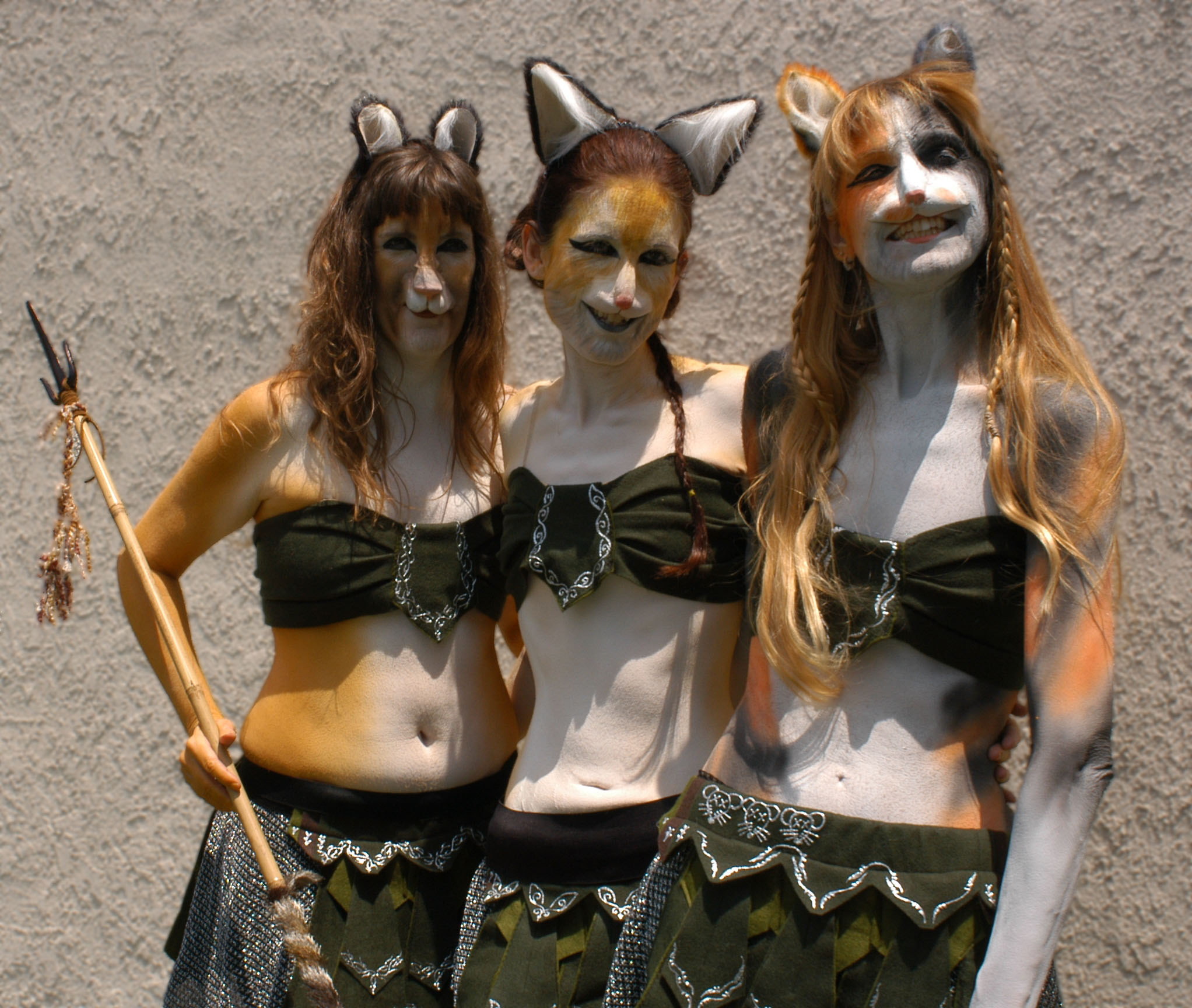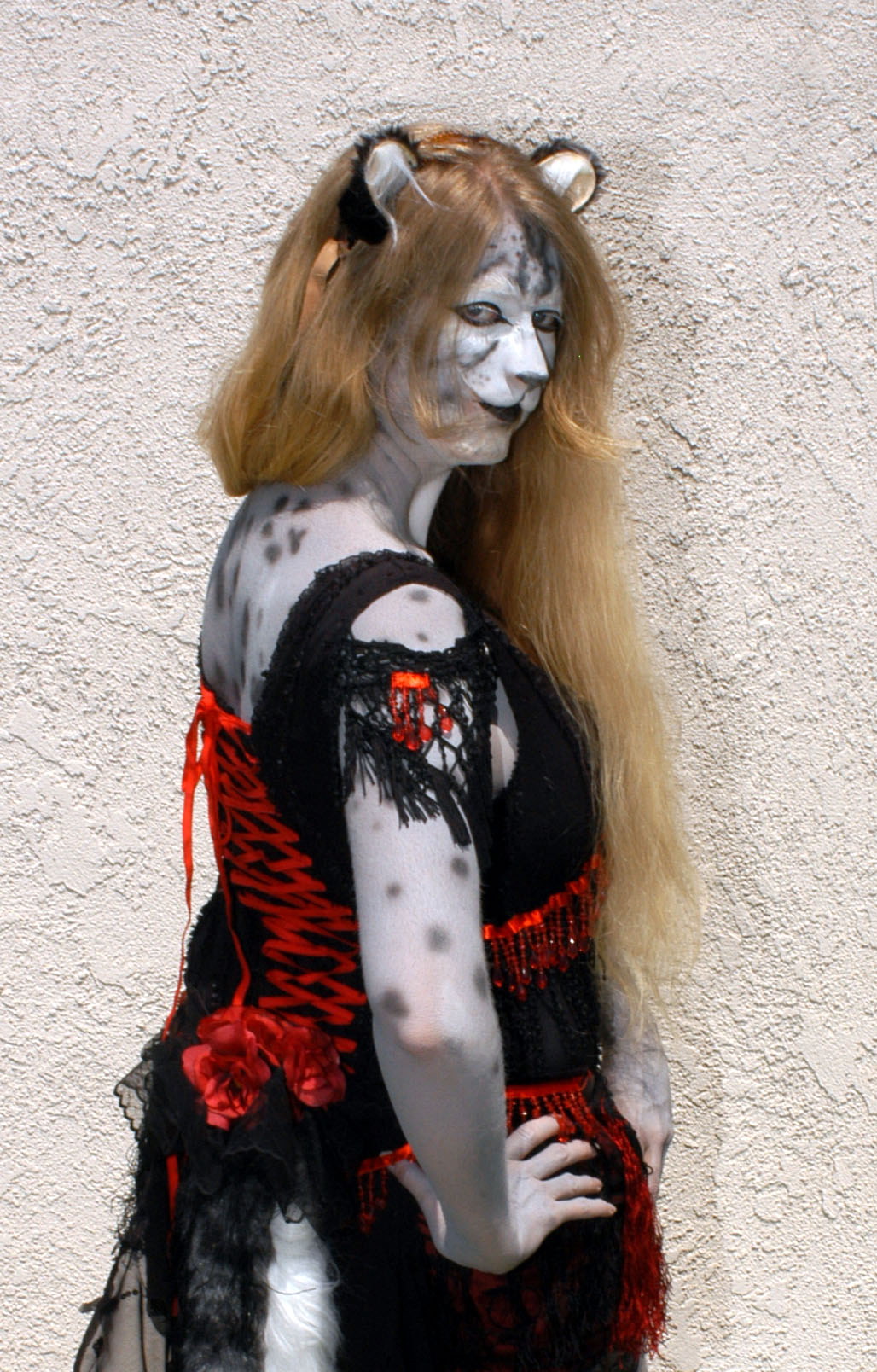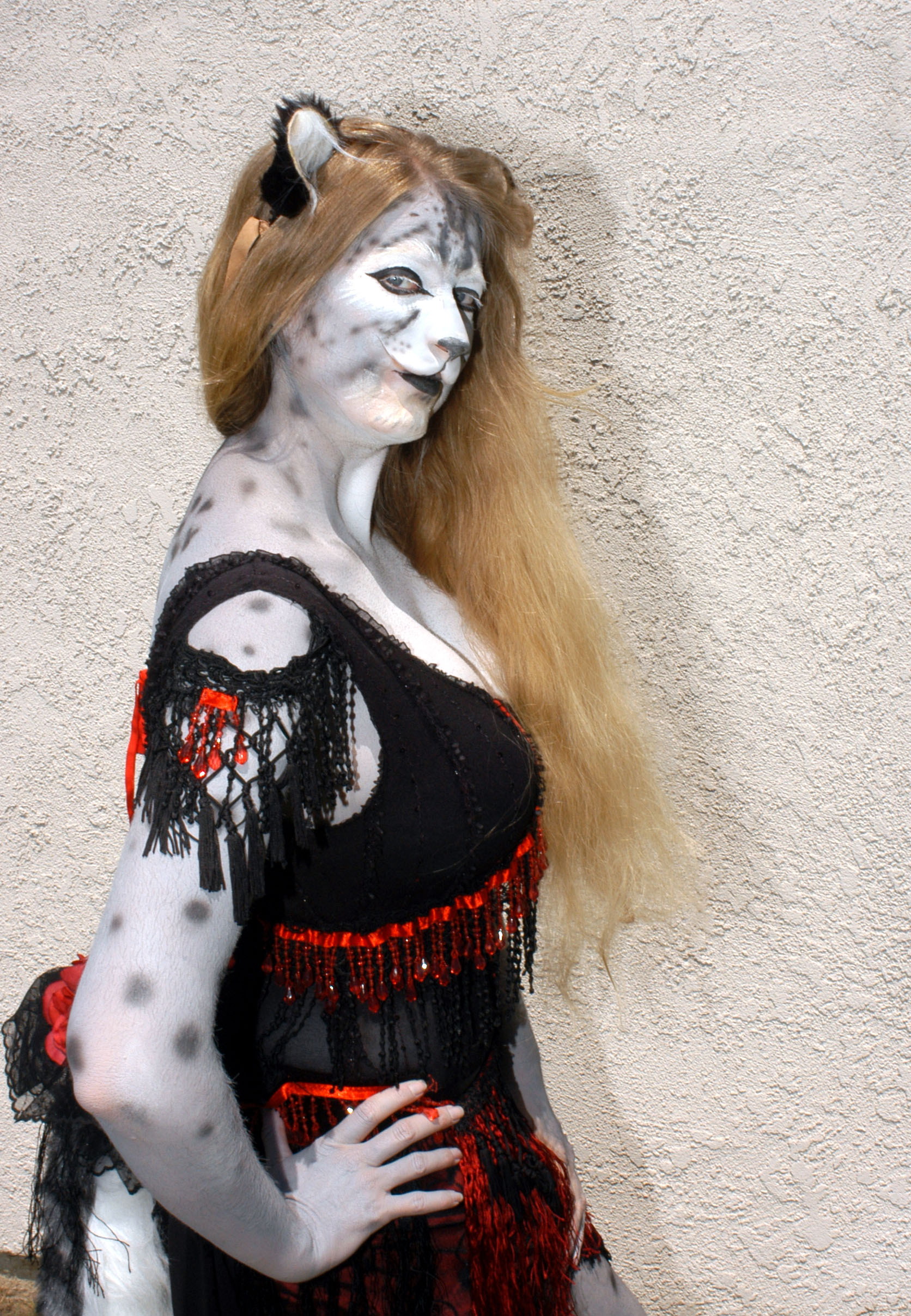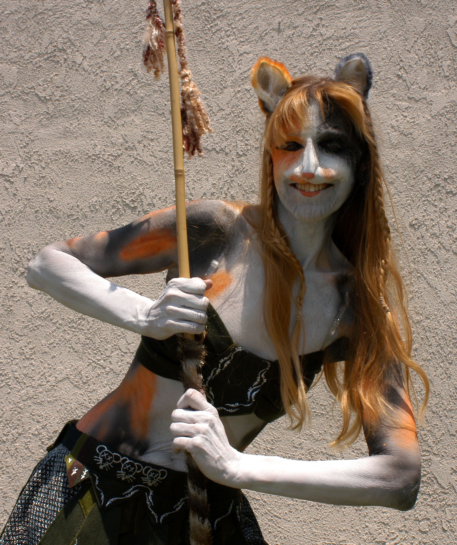 Stalking Cat body-painted us once, a long time ago, for a dance performance called Cabaret Fur Le Danse. (Cabaret Fur Le Danse Program.)  We were members of Myths and Legends Dance Troupe, which included many of the same members (including us) of Tribe Roman Morga.