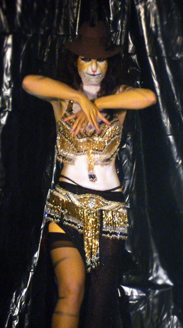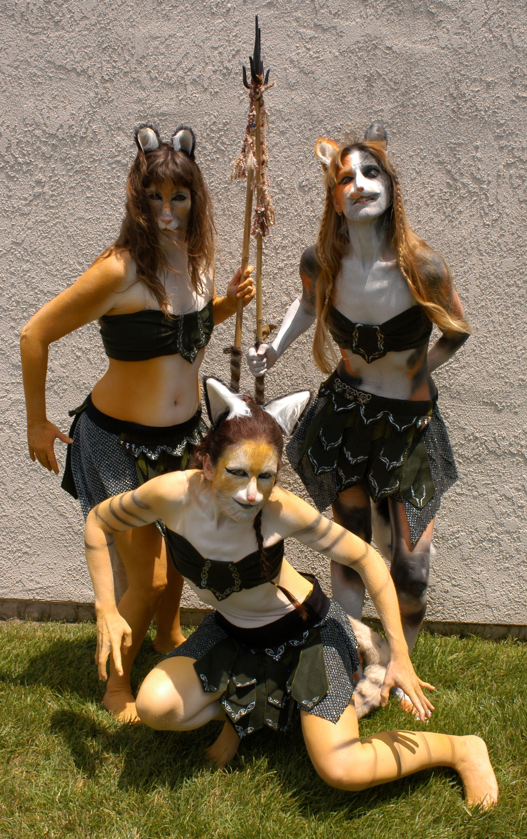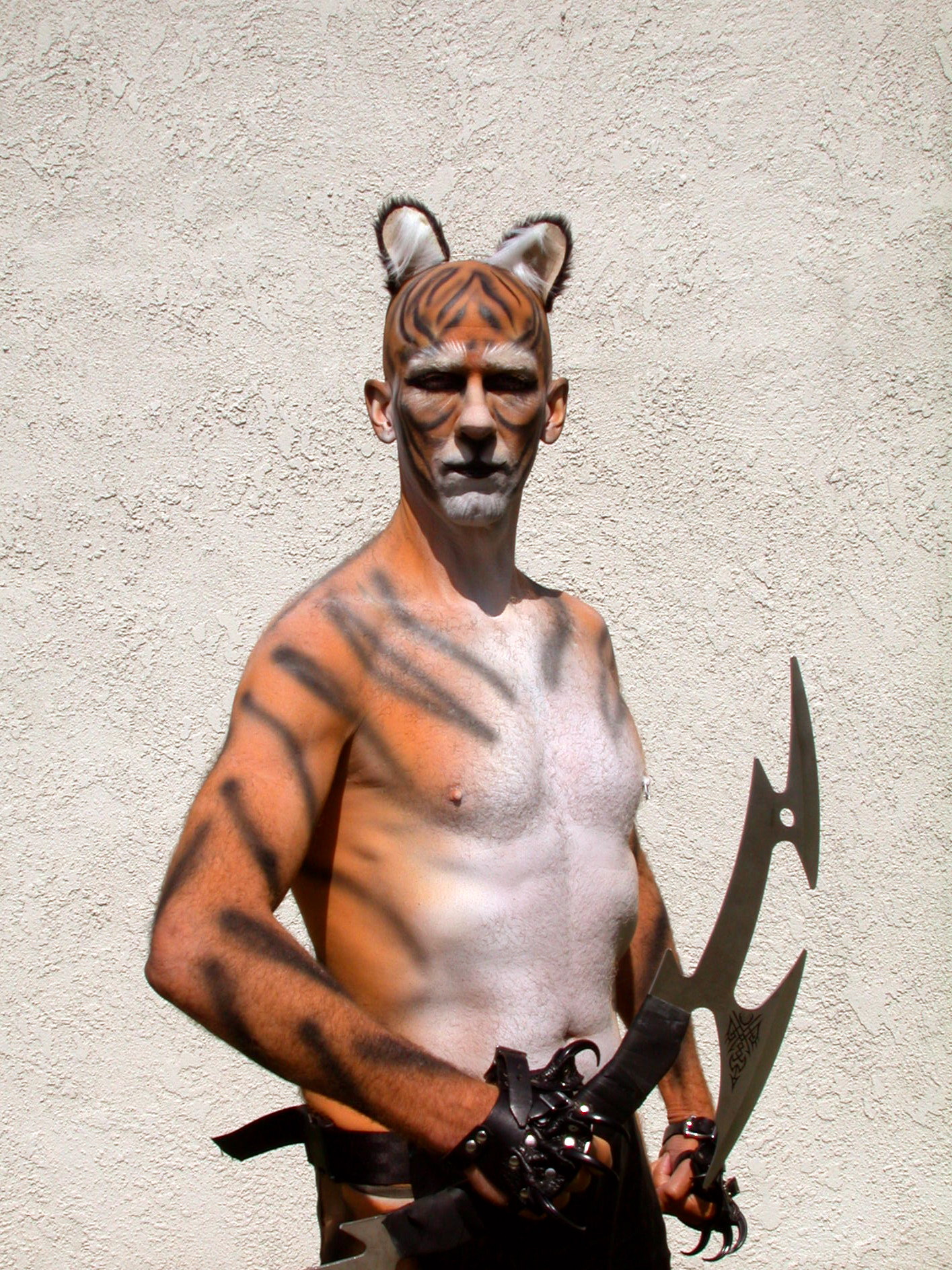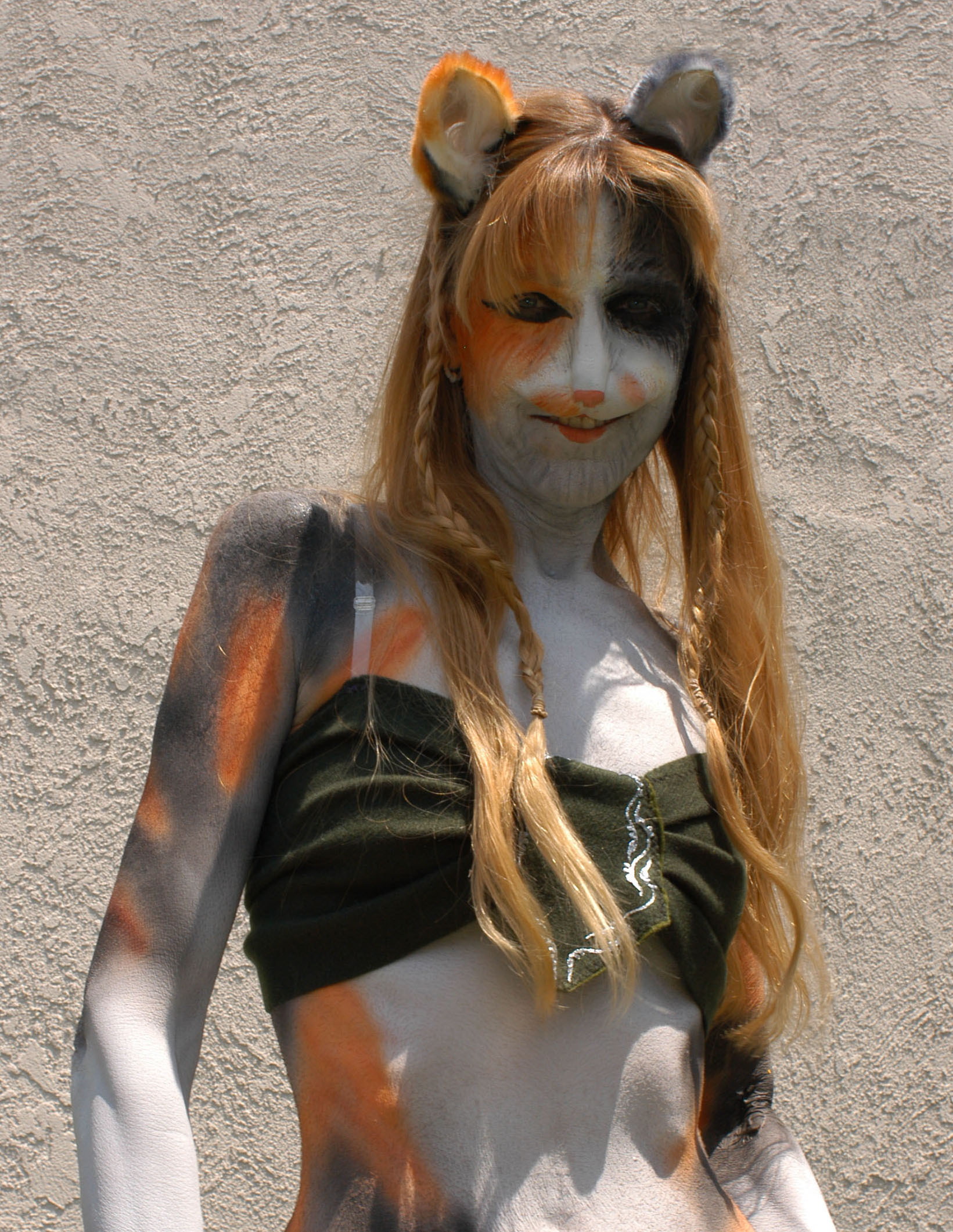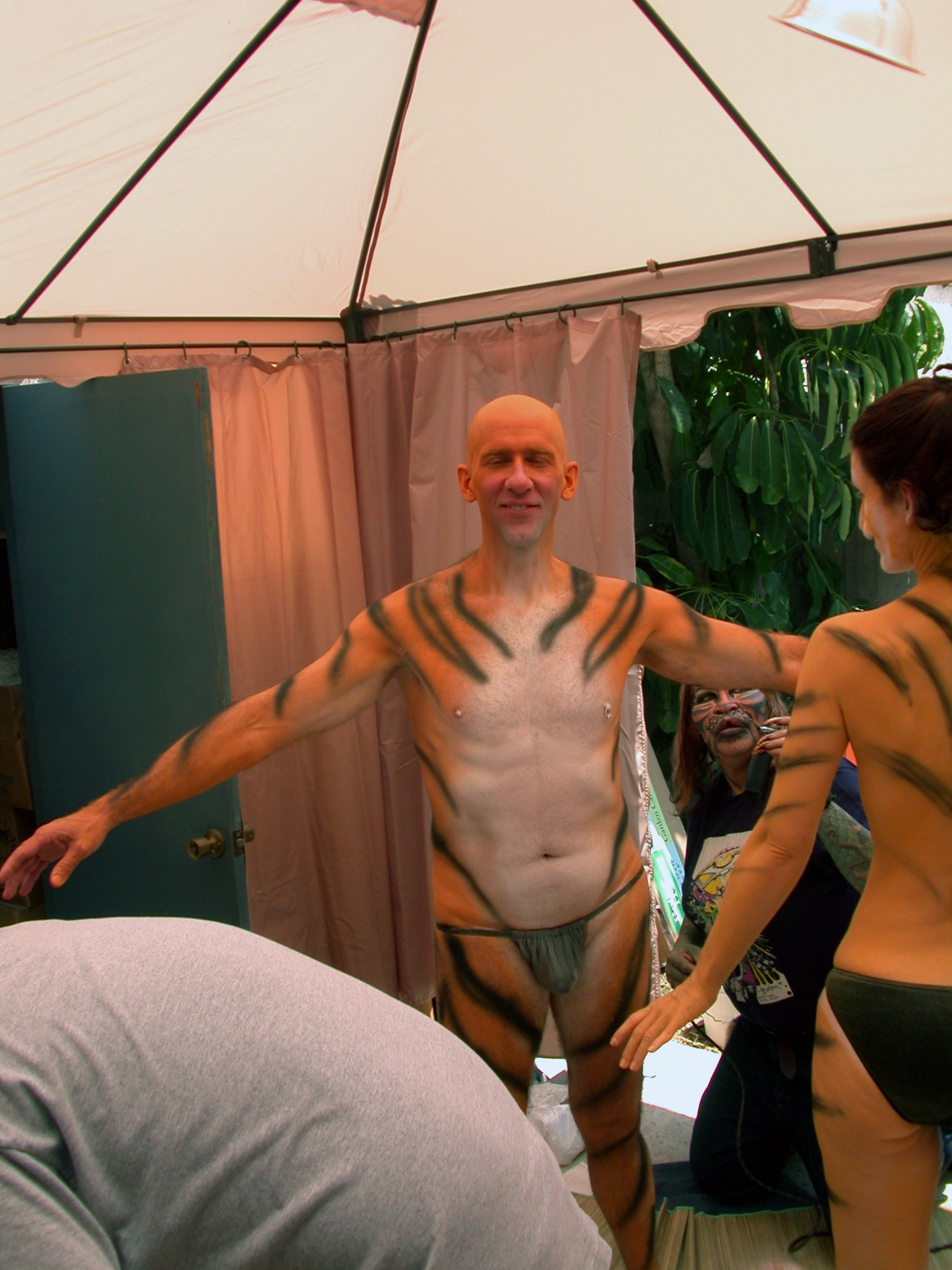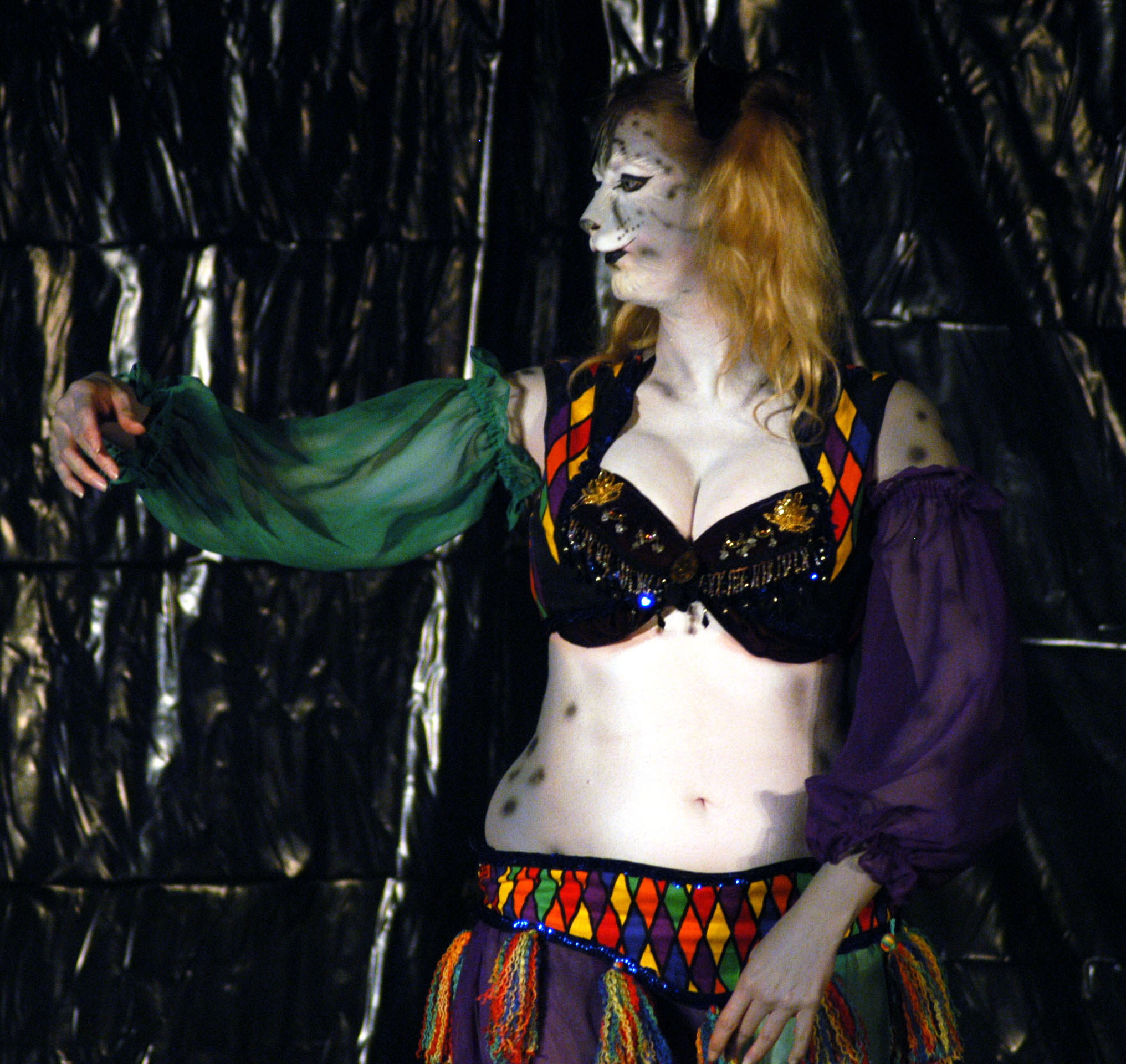 Stalking Cat body-painted us once, a long time ago, for a dance performance called Cabaret Fur Le Danse. (Cabaret Fur Le Danse Program.)  We were members of Myths and Legends Dance Troupe, which included many of the same members (including us) of Tribe Roman Morga.