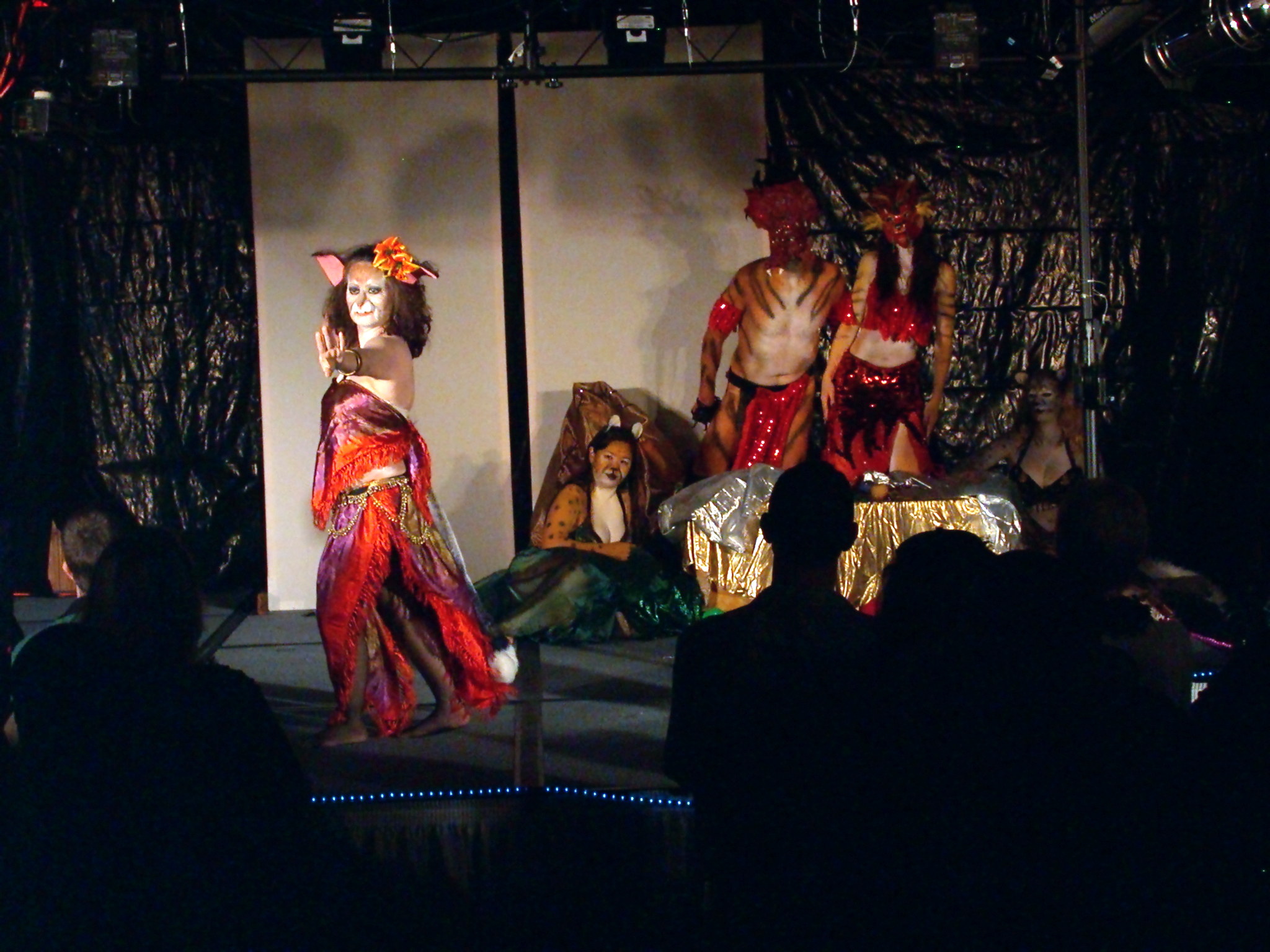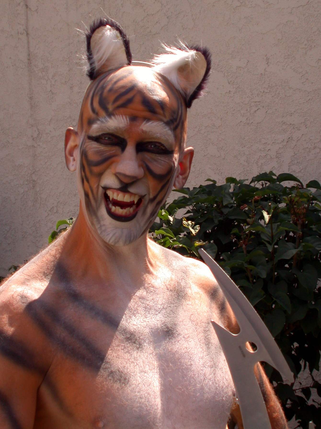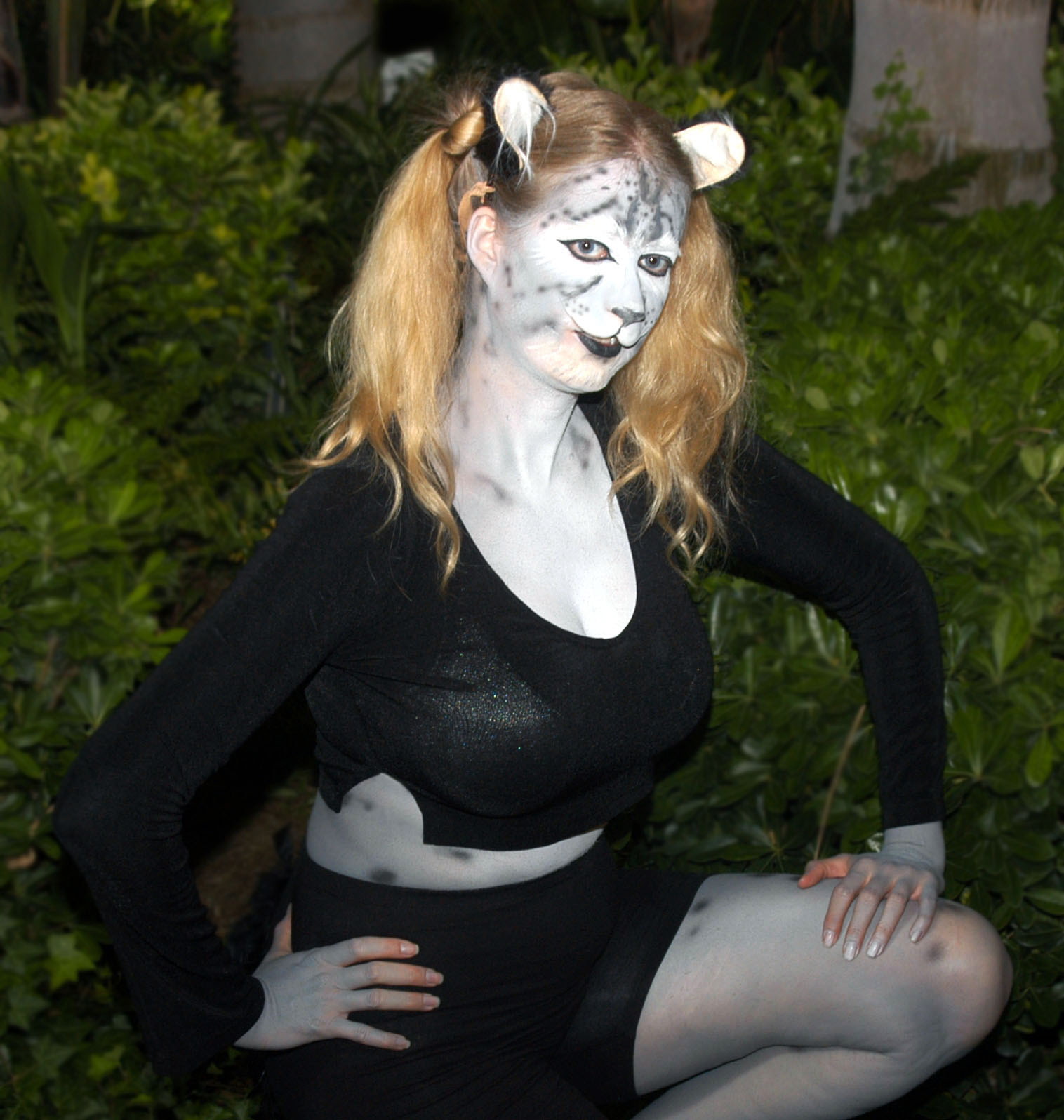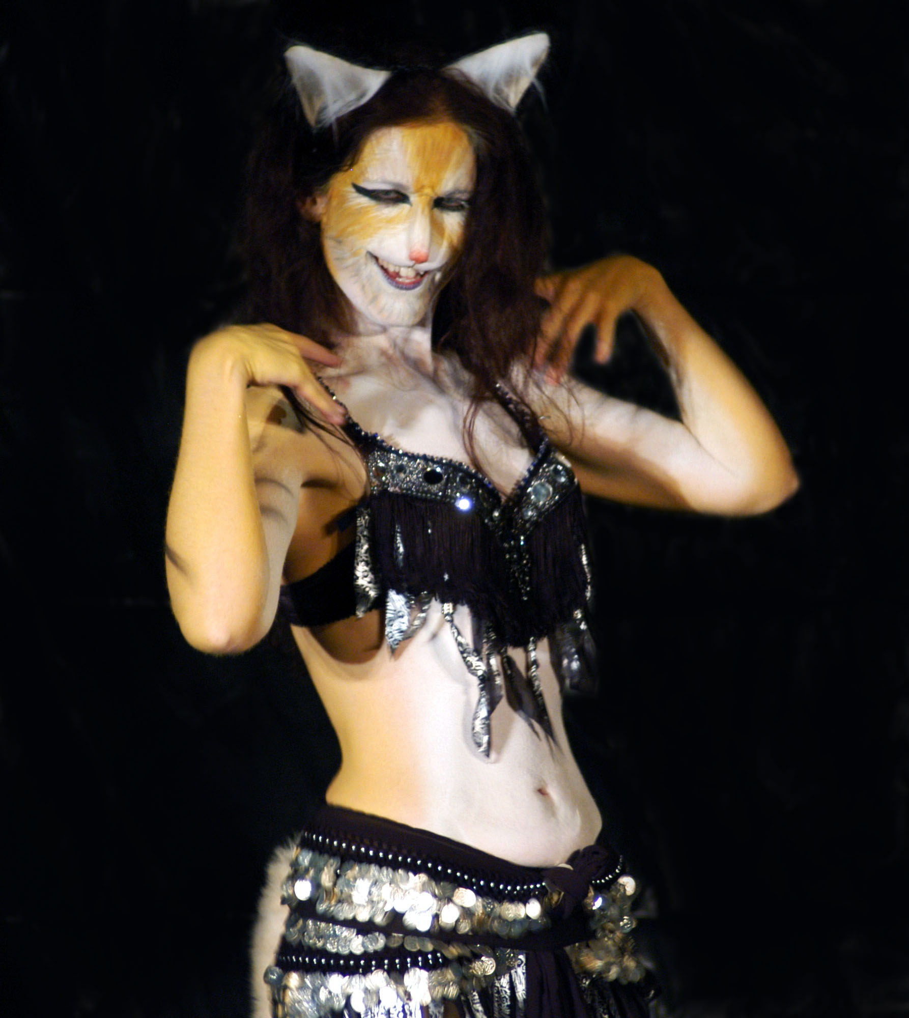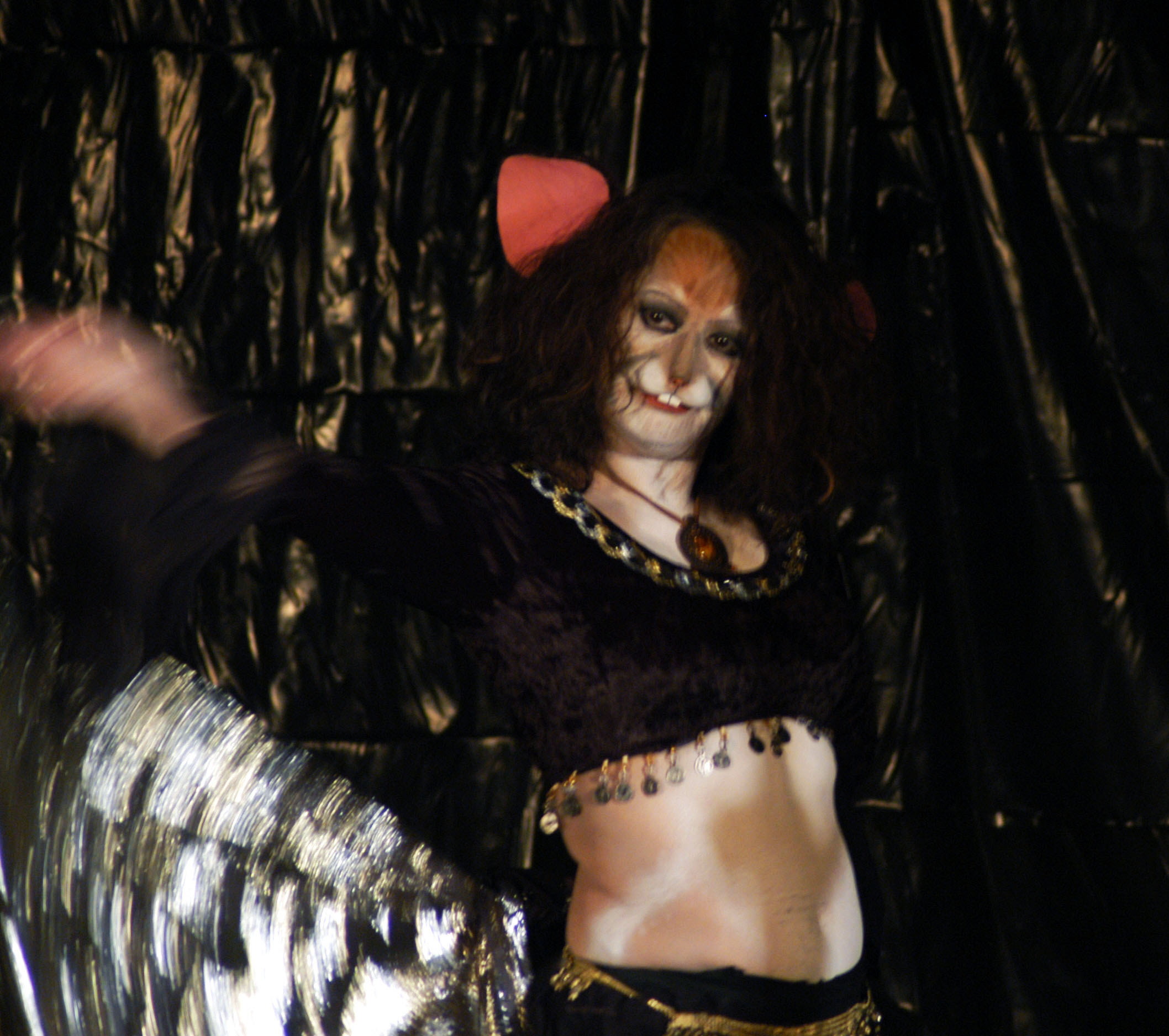 Stalking Cat body-painted us once, a long time ago, for a dance performance called Cabaret Fur Le Danse. (Cabaret Fur Le Danse Program.)  We were members of Myths and Legends Dance Troupe, which included many of the same members (including us) of Tribe Roman Morga.