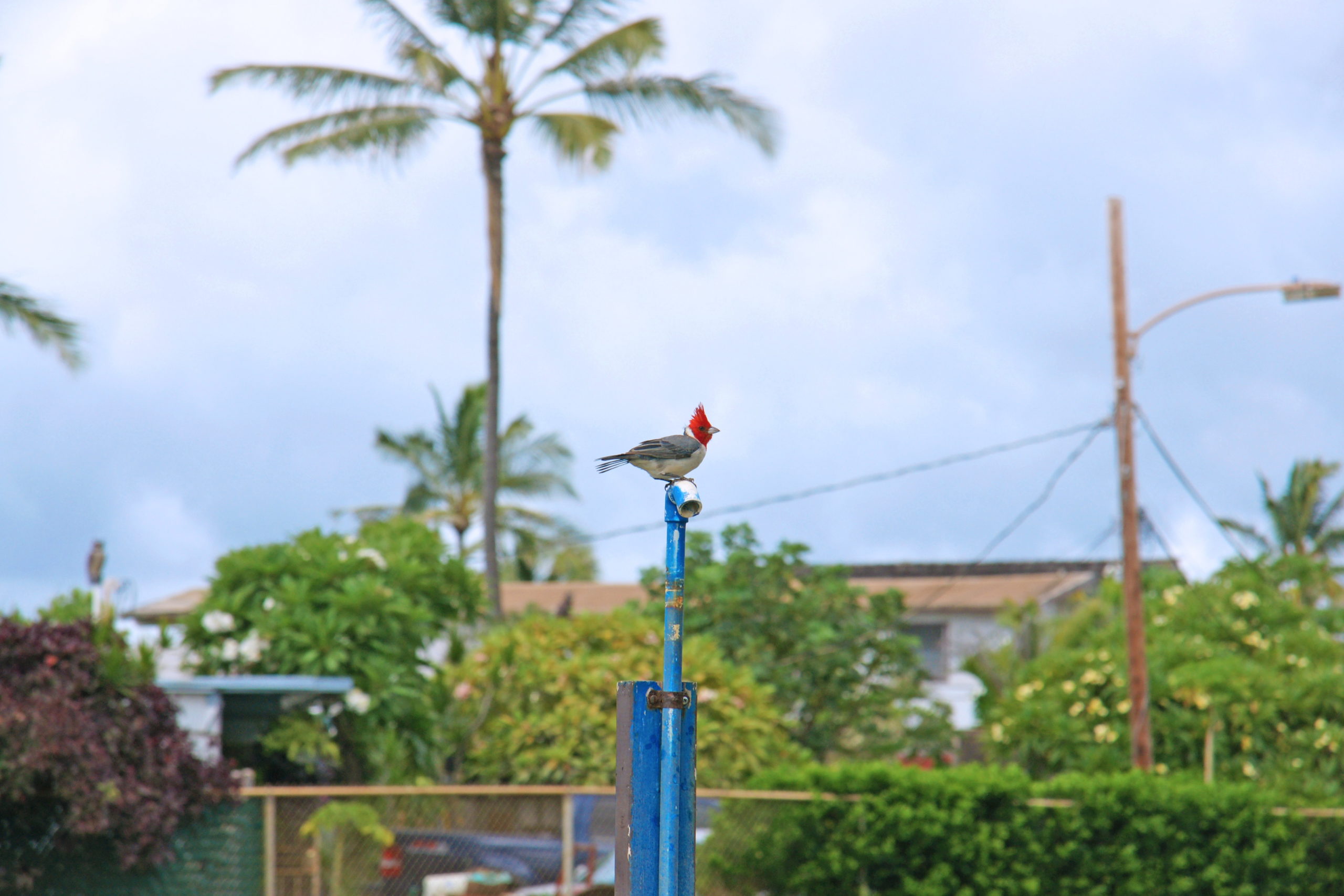 The Brazilian Cardinal, also called the Red-crested Cardinal (Paroaria coronata), was introduced to O’ahu around 1930. We don’t know why he’s on this water pipe rather than searching for food.