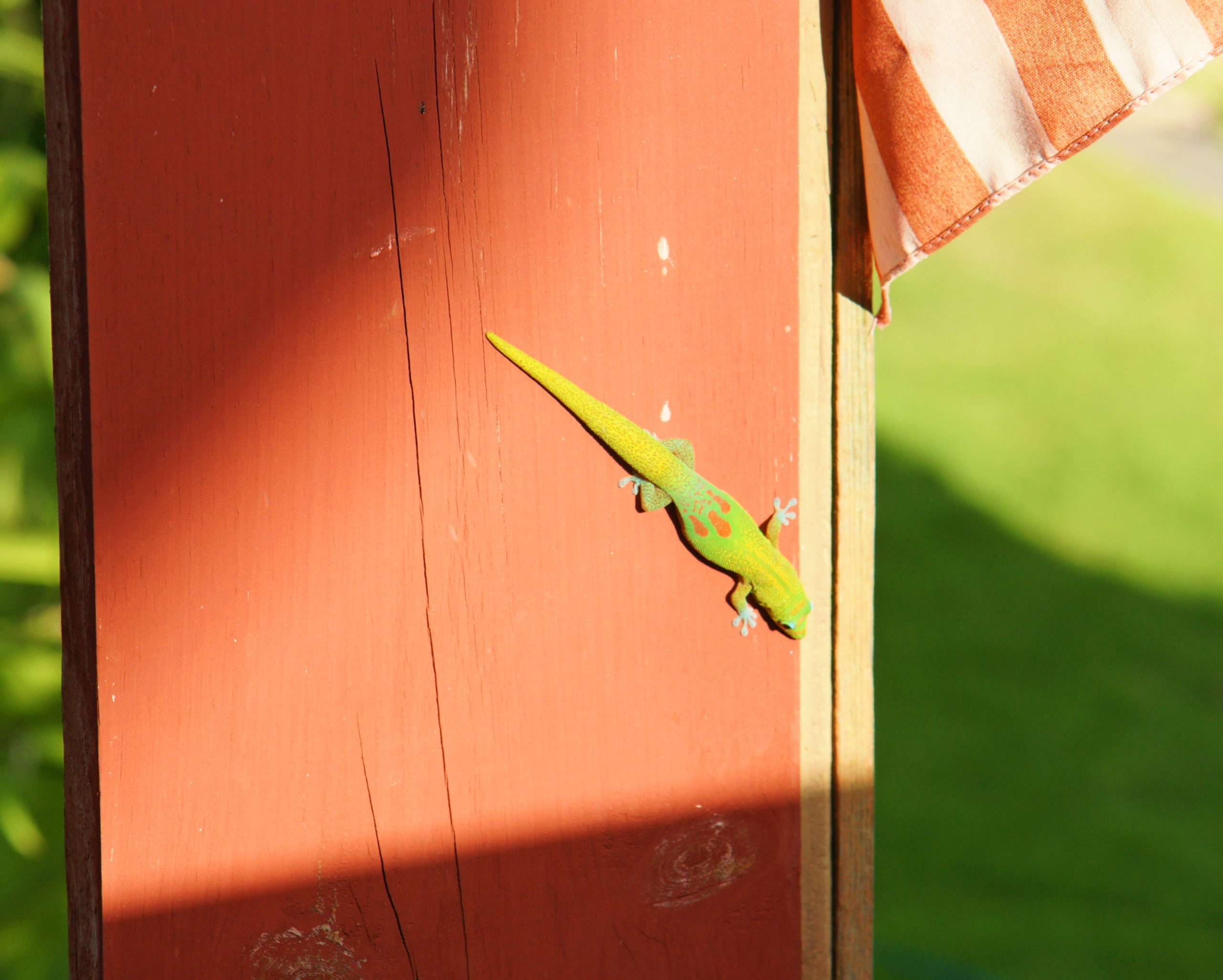 The Gold Dust Day gecko (Phelsuma laticauda) feed on various insects and other invertebrates, and are also capable of eating other smaller lizards. They also eat soft, sweet fruit and pollen and nectar from flowers, often congregating in groups of many individuals to feed off of one plant. The males are rather aggressive and can be quite quarrelsome. They do not accept other males in their territory. In captivity, where the females cannot escape, the males may also seriously wound a female.