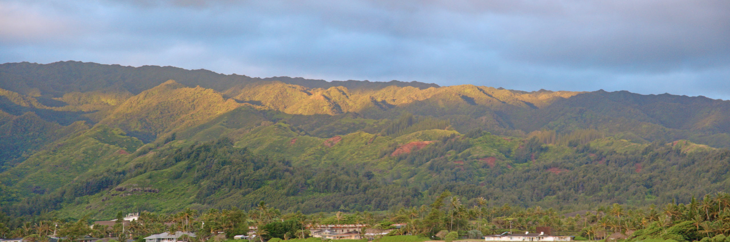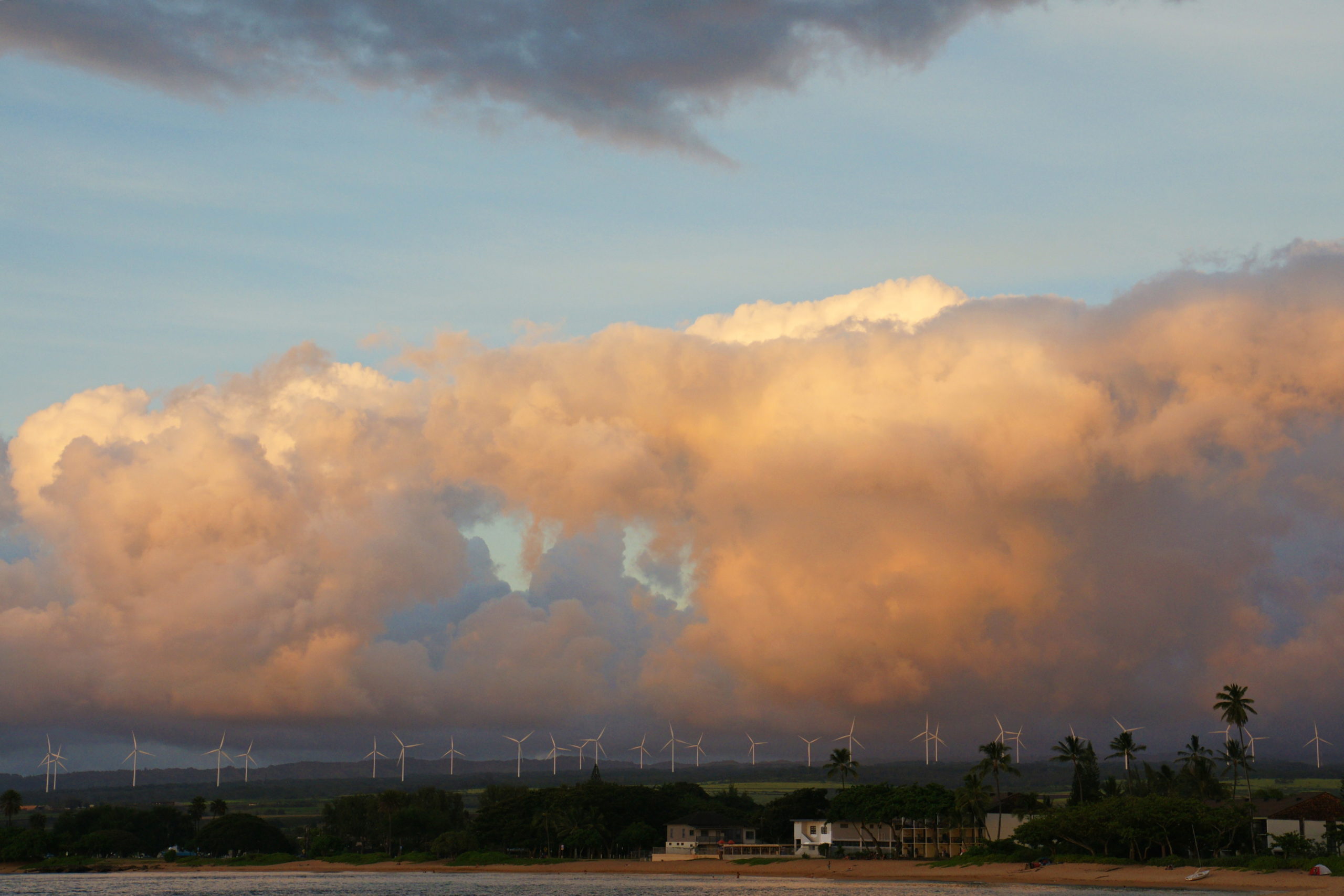 From our porch, we can see the sun rise each morning. Yes, the Hawaiian Islands are mountains, but our view to the east shows a flat, forested area populated mostly by windmills.