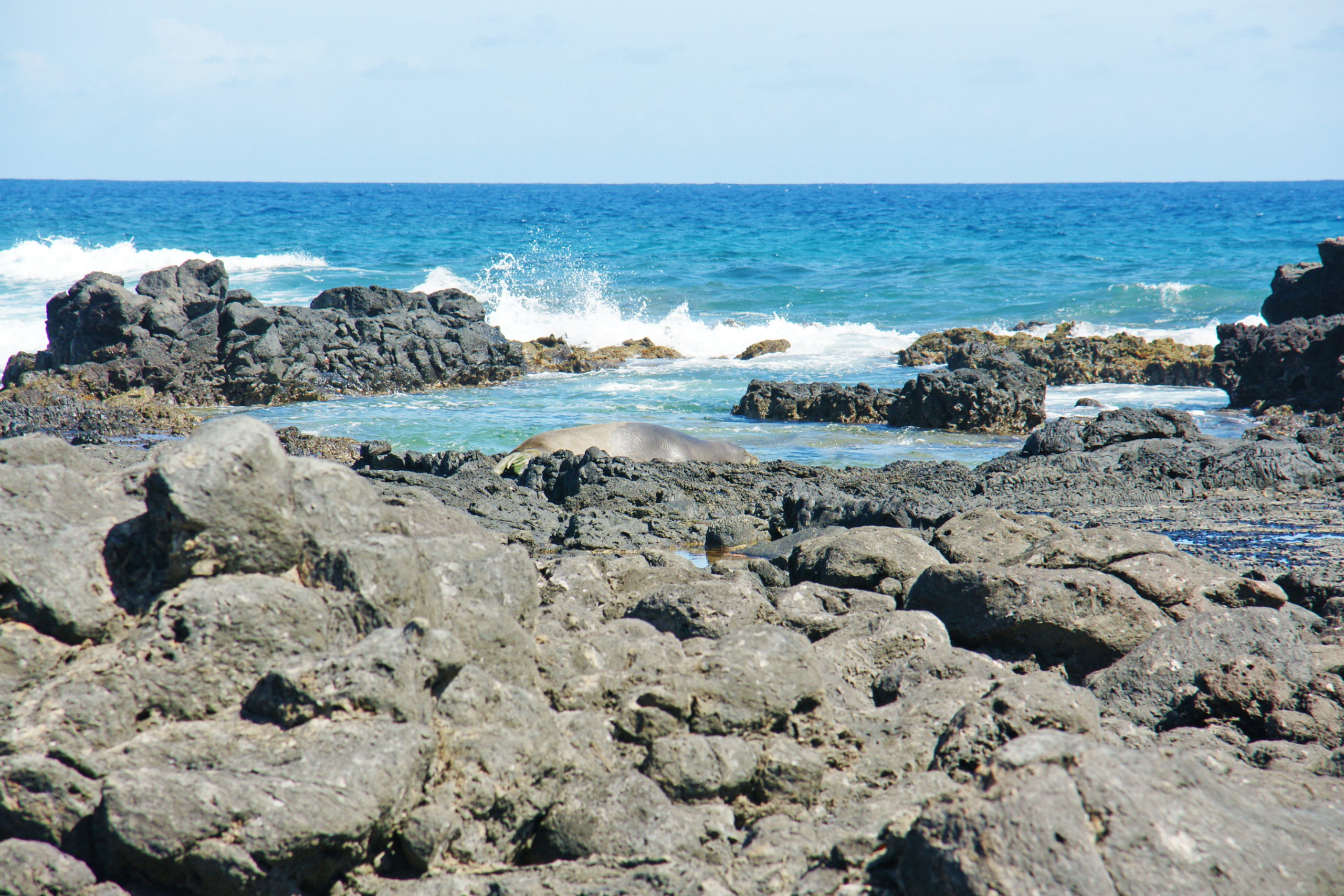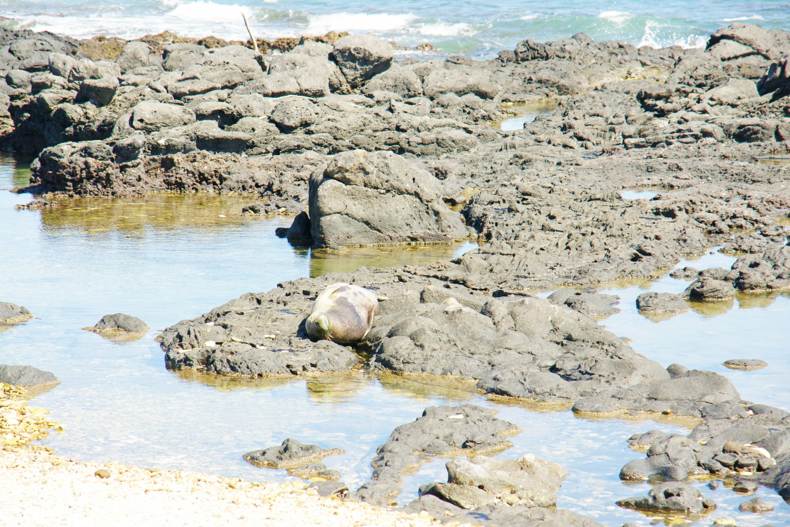 Behold another Hawaiian Monk seal, sleeping peacefully on its bed of stone. FYI, the Hawaiian monk seal is the only seal native to Hawaii, and, along with the Hawaiian hoary bat, is one of only two mammals endemic to the islands. All other mammals, including humans, have been introduced by humans.