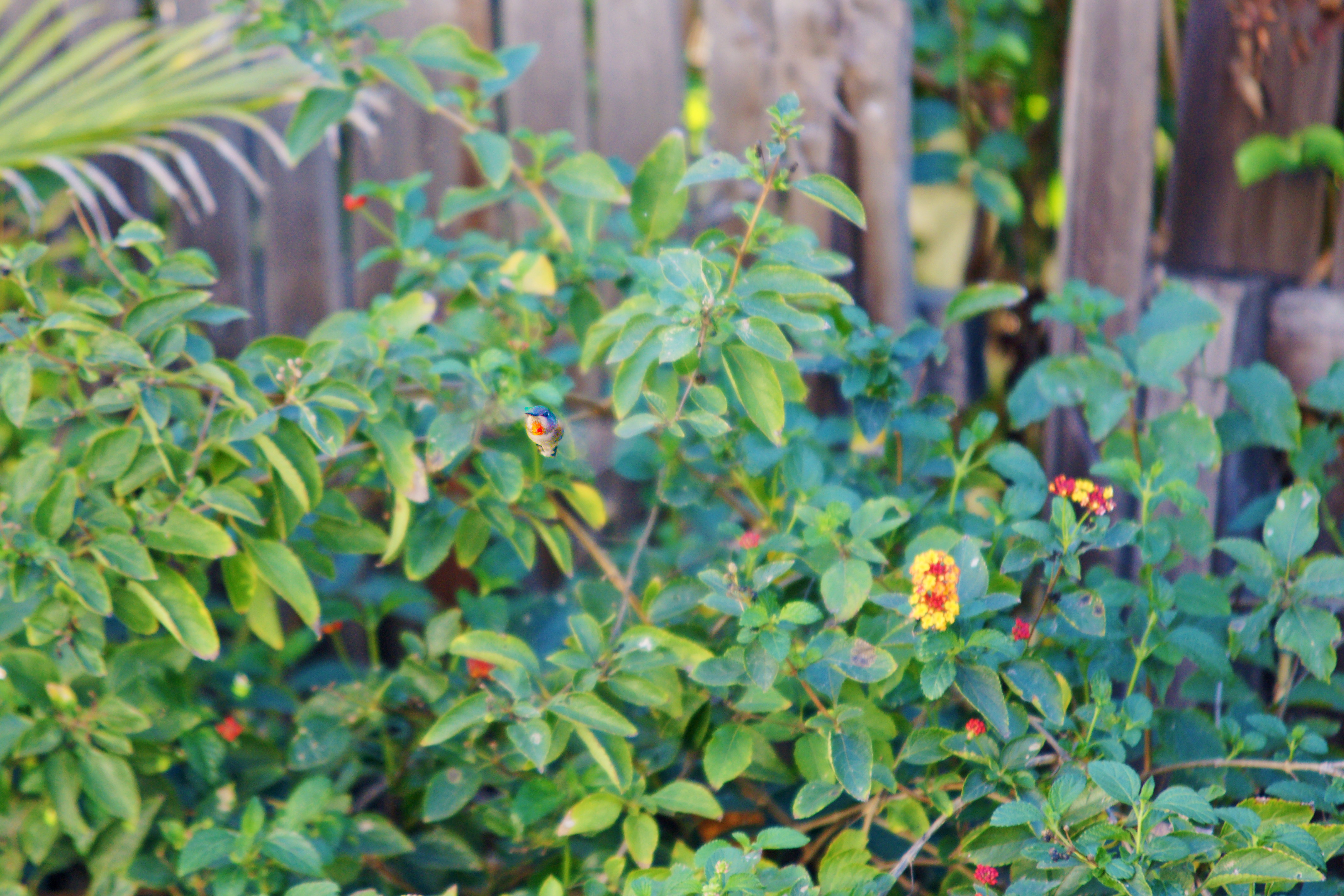 Just to the left of center you can see a hummingbird flying towards the camera. Notice that the bird is horizontal to the ground when flying, contrasted with vertical when hovering.