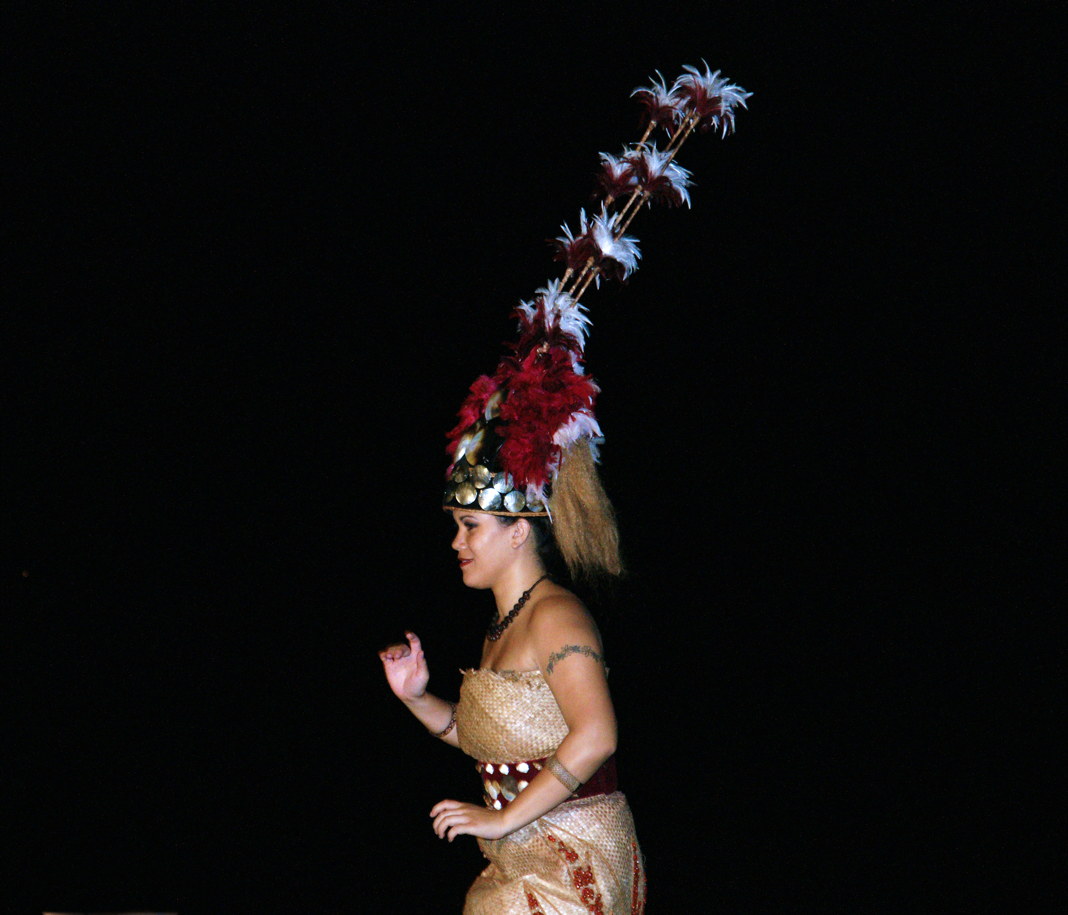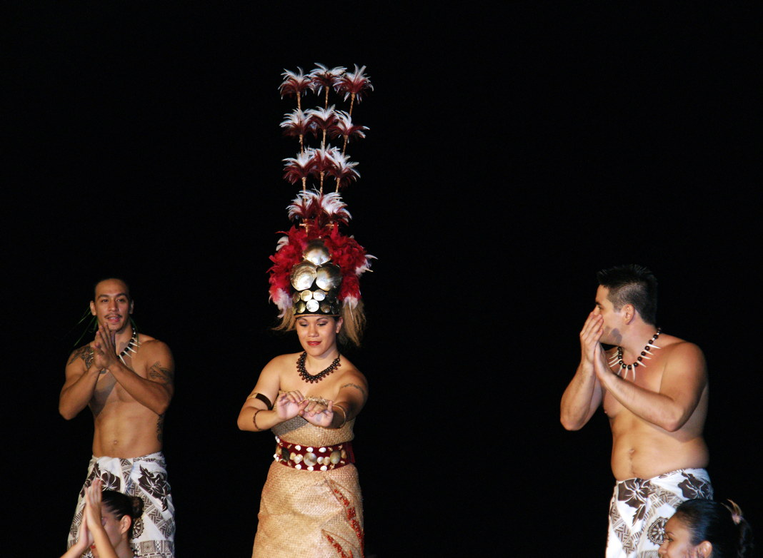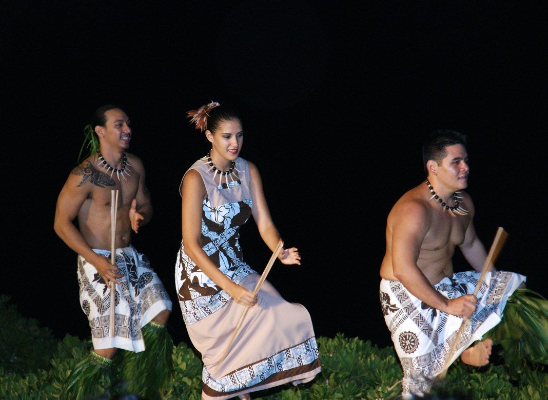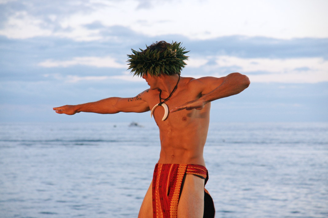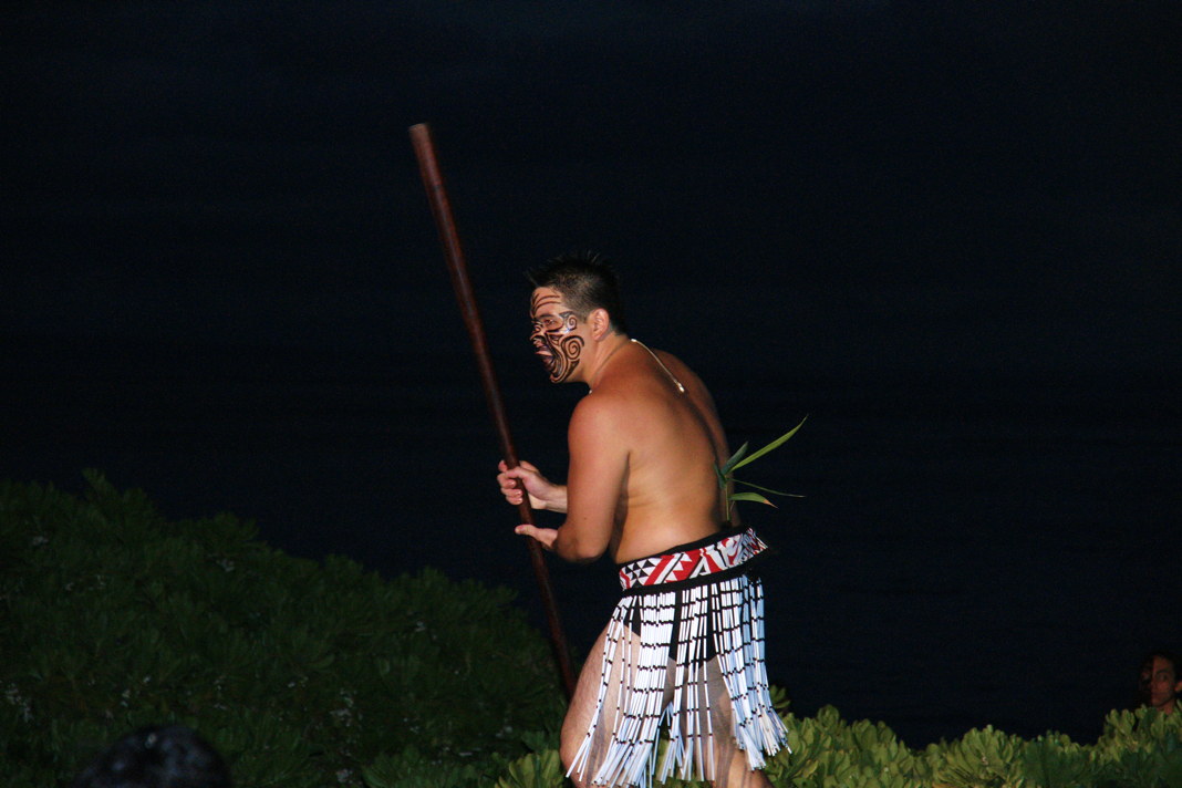 This performer’s face paint is imitation of Hawaiian tattoos.