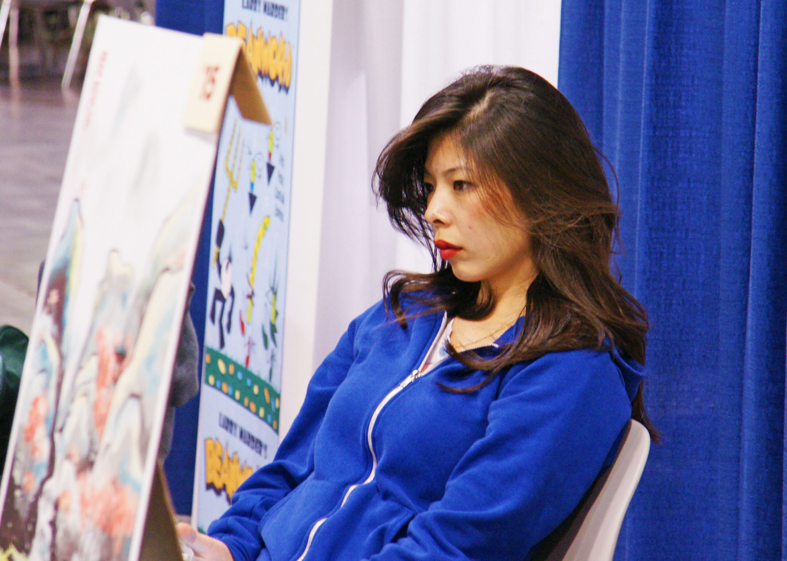 If you are going to be sad at WonderCon, I guess it’s best to wear a blue outfit and sit in front of a blue curtain.