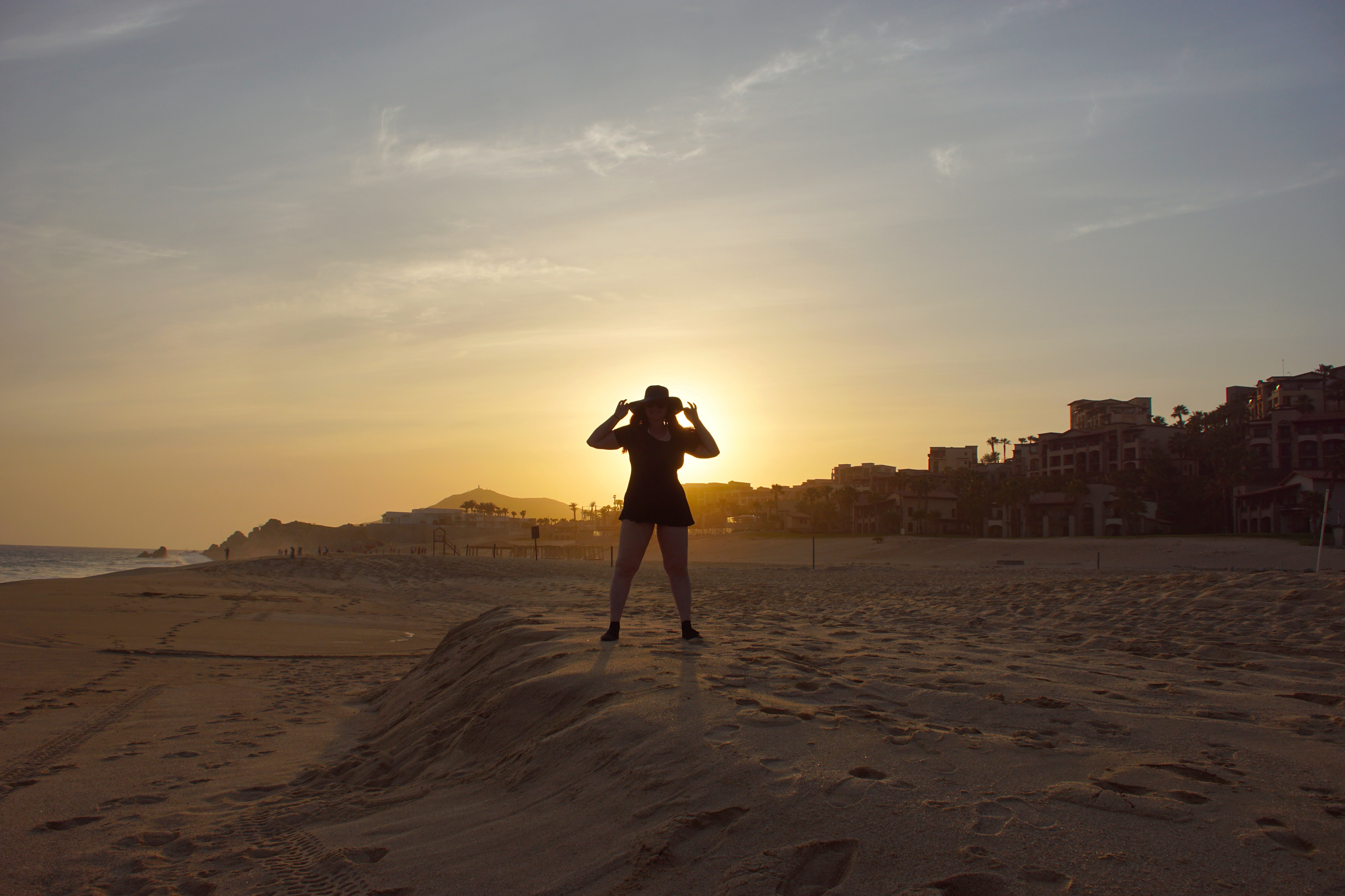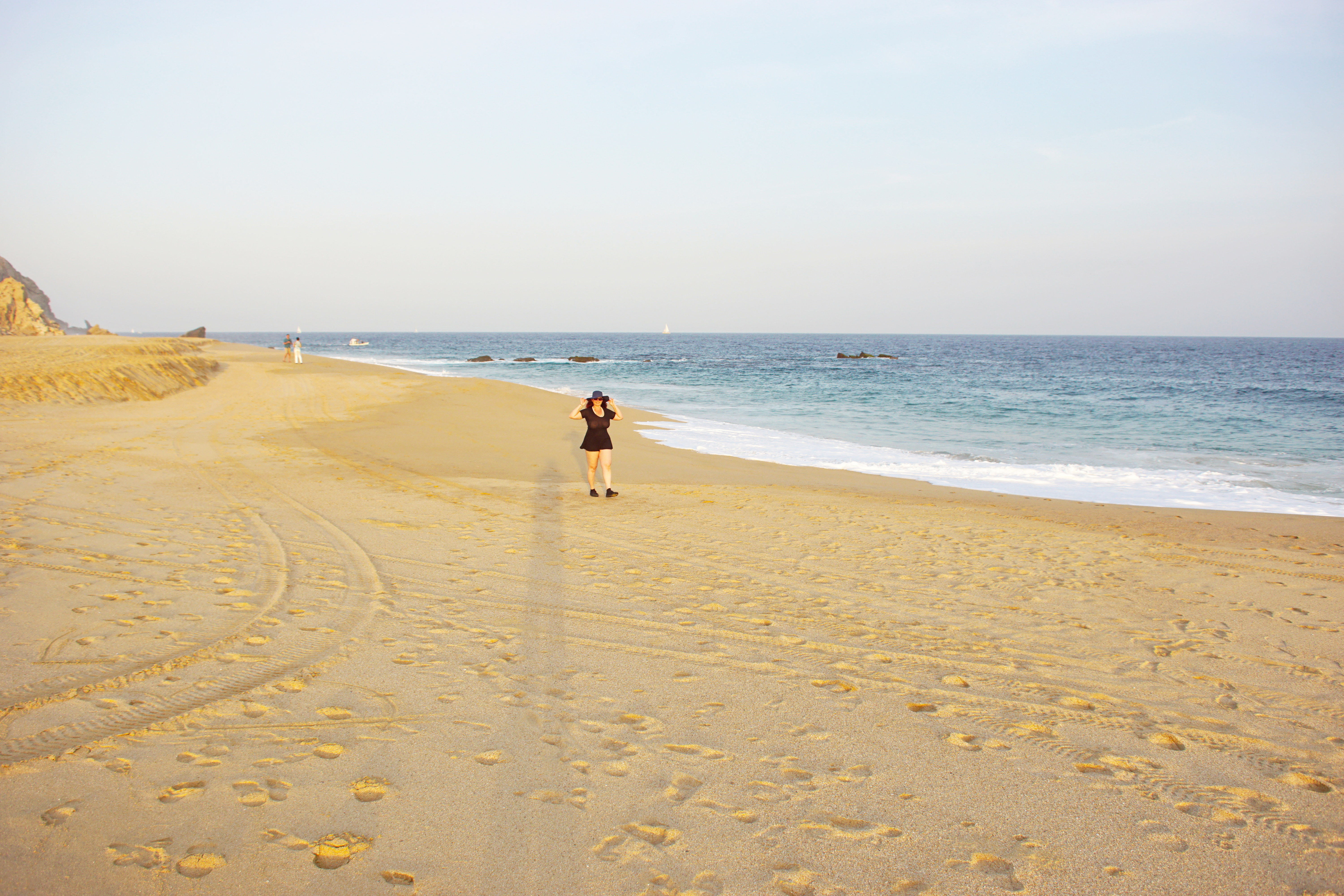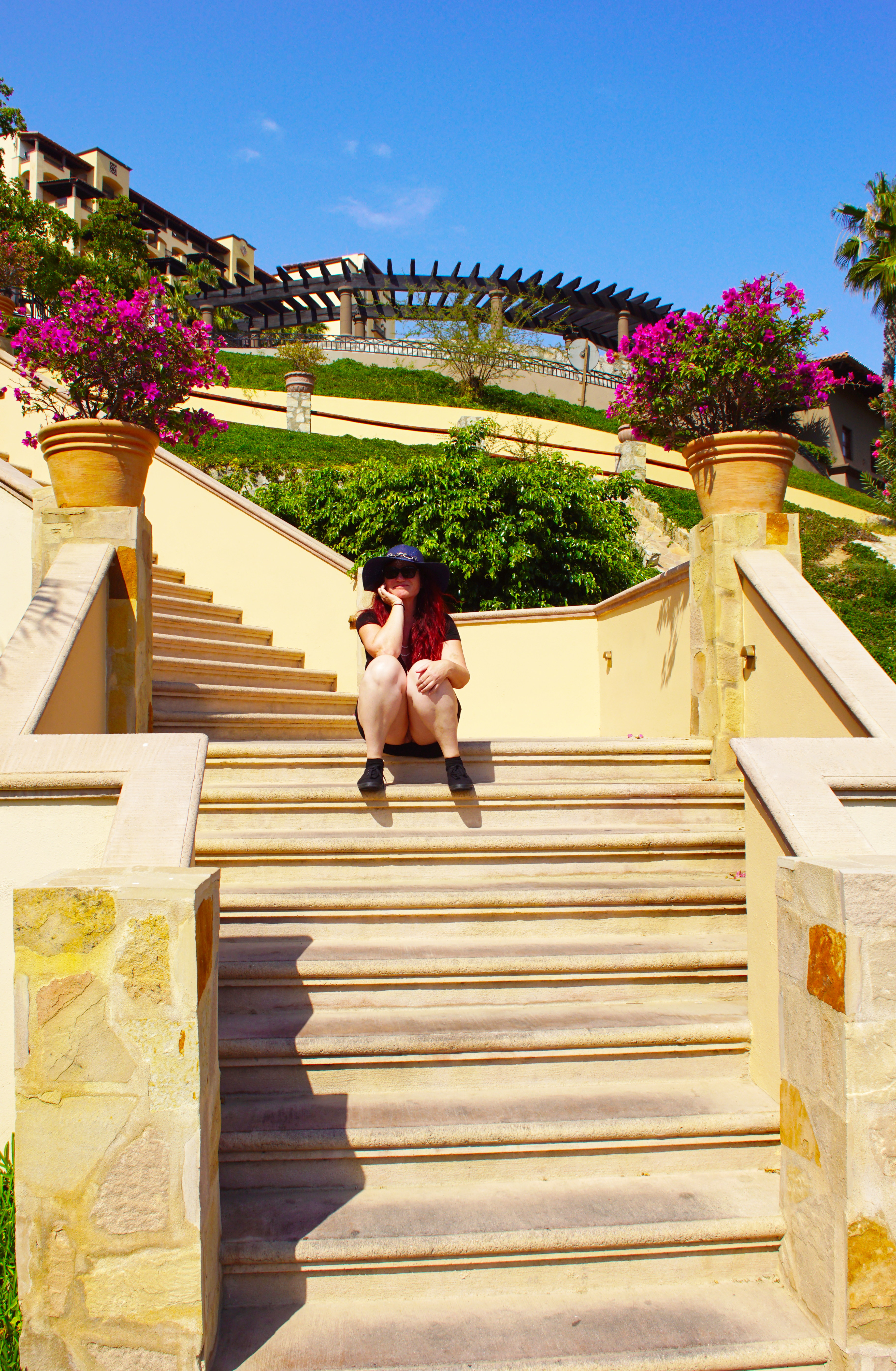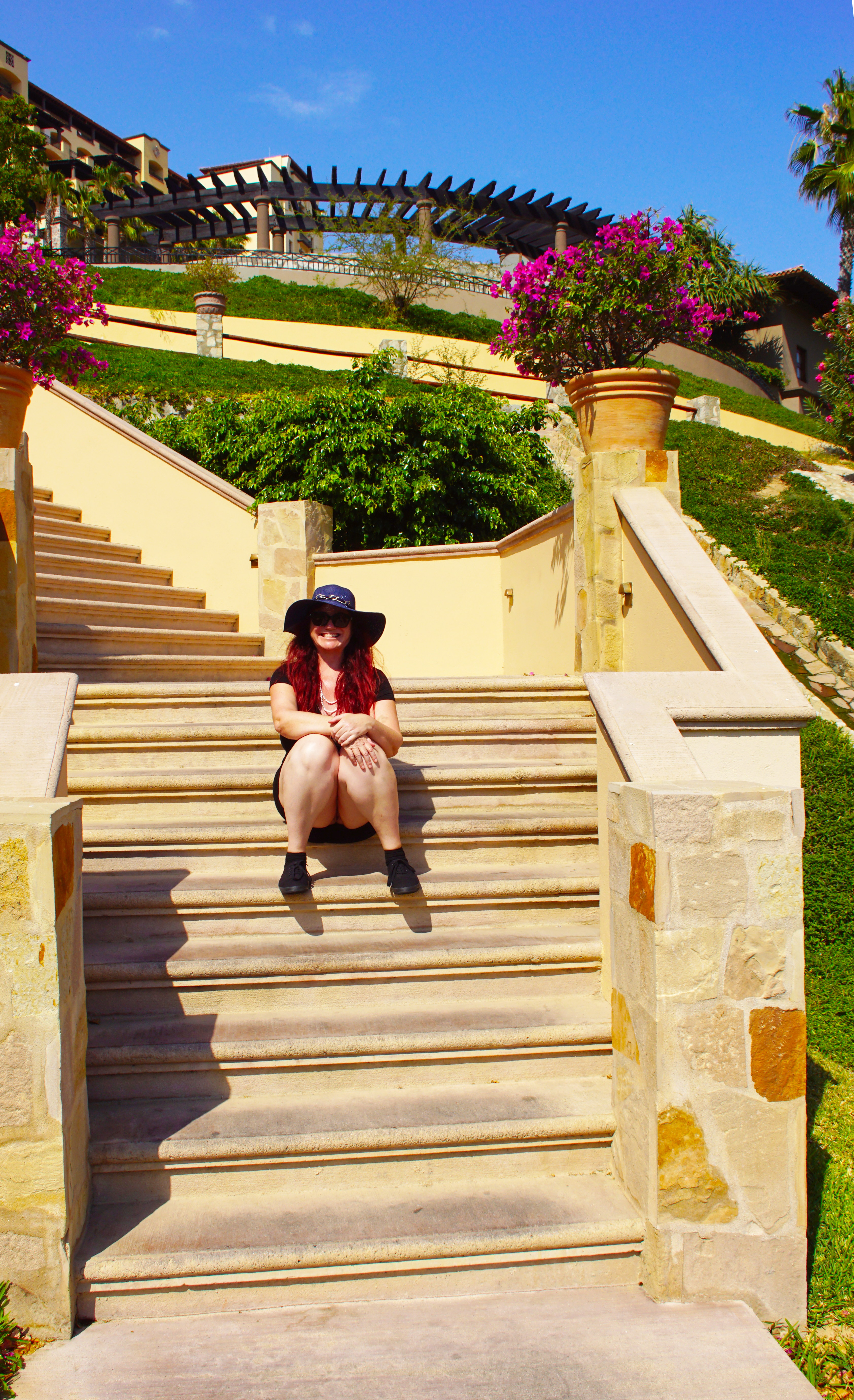 Two hours later we arrive, and the moment we leave the airport terminal we are happy to see bright blue skies and feel the warm sunlight on our skin. There is a sign that says “Cabo” right where the hotel shuttles are, so we take the gratuitous “Wooo Cabo!” photos. Our vacation has officially begun!