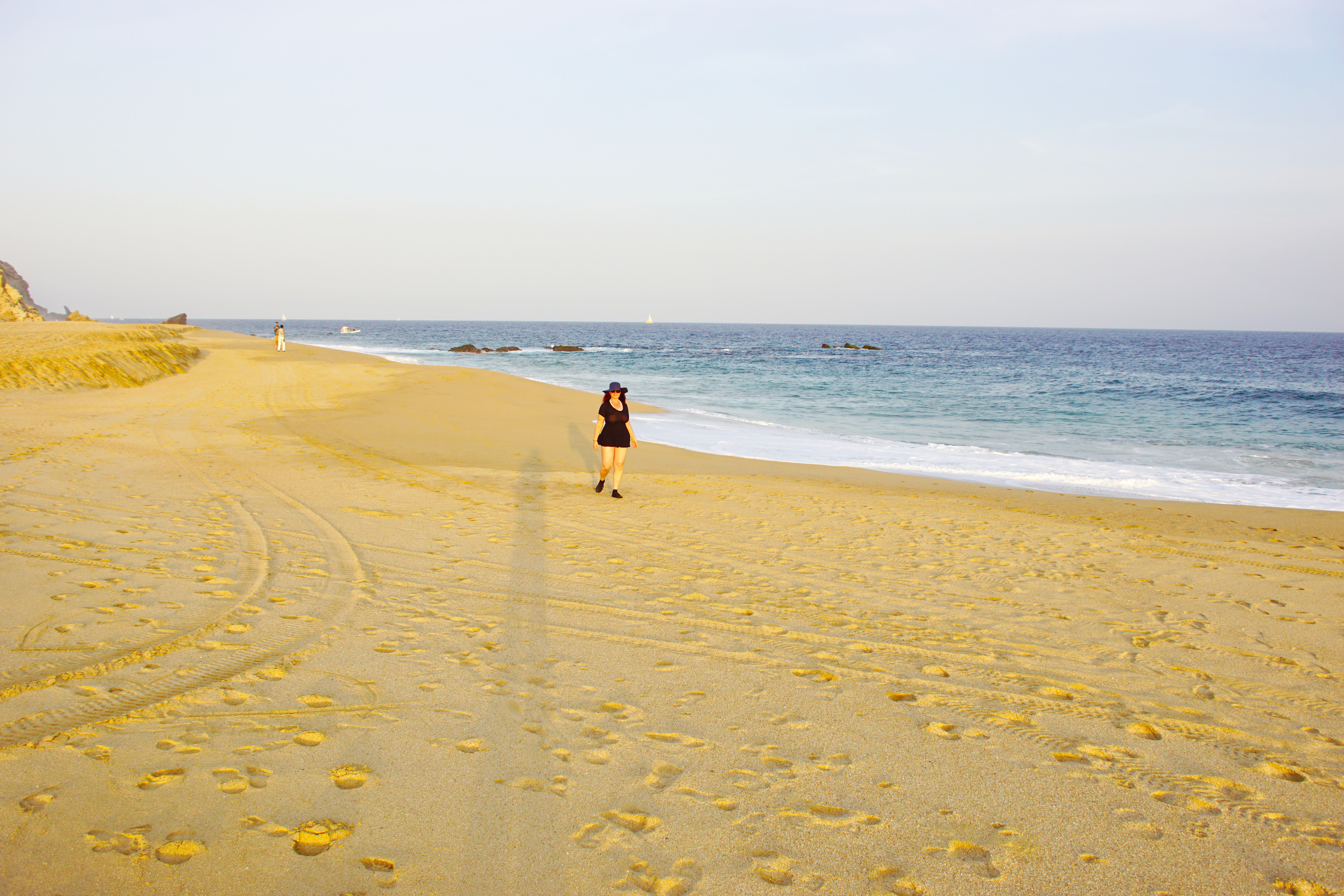 Just past the main pool is beach access – exactly what we came here for! A long stretch of sand to walk along, the sun starting to set, a warm day with a cool breeze, and crashing clear blue waves. The waves are too rough for swimming, but it’s still lovely to walk alongside such energy!